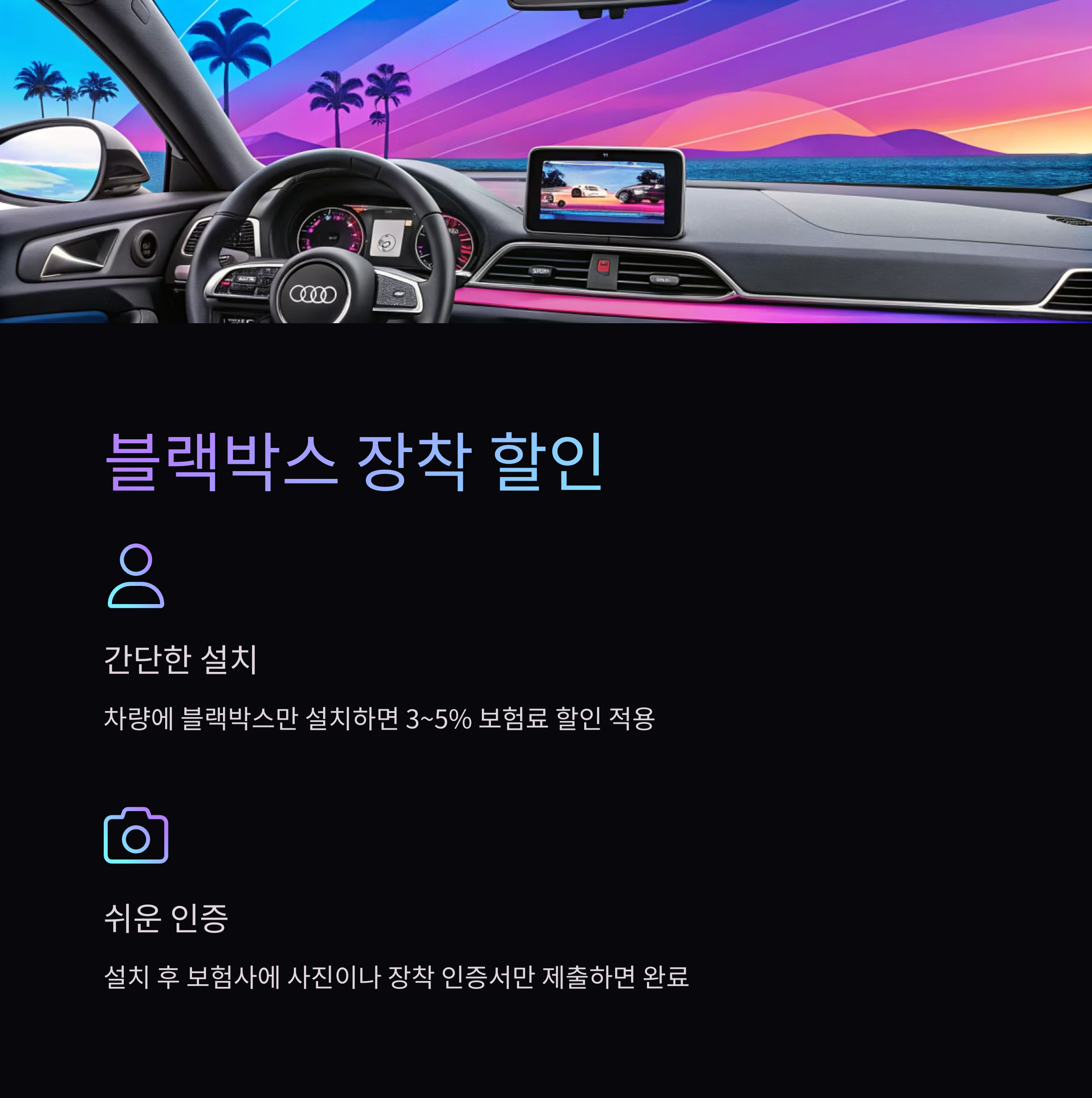 차량에 블랙박스를 설치하고 인증만 받으면 3%~5% 수준의 보험료 할인을 받을 수 있습니다.