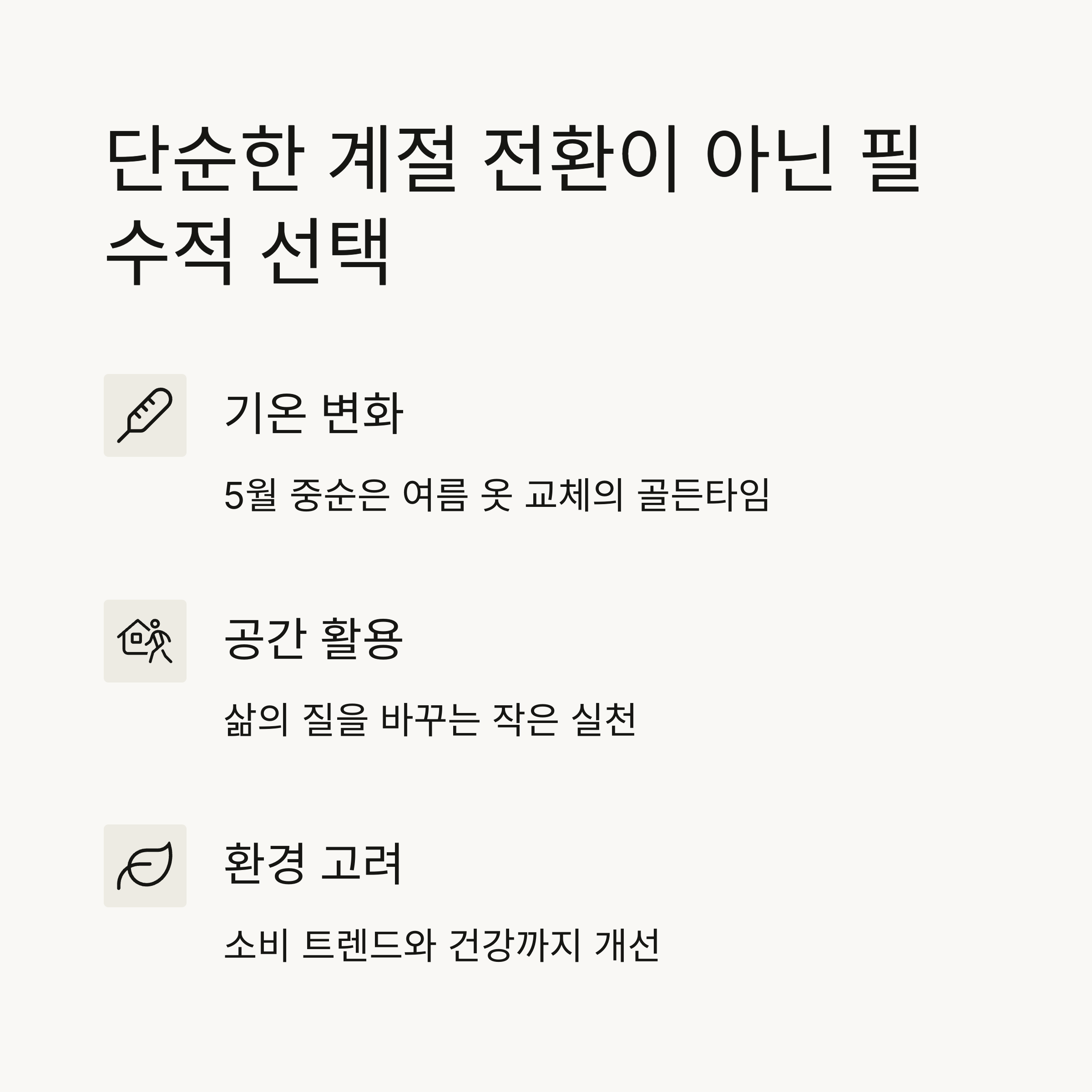 5월 중순은 여름 옷 교체의 골든타임이며, 삶의 질을 바꾸는 작은 실천입니다