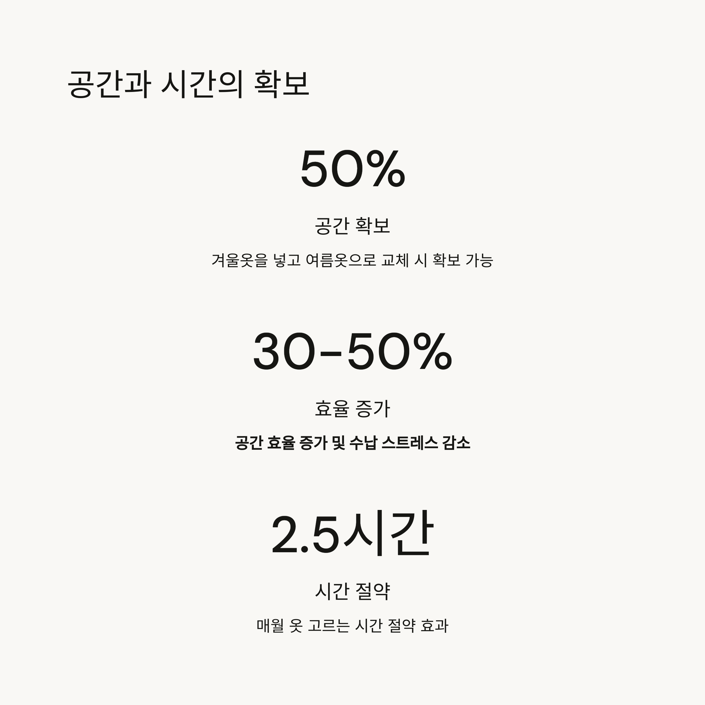 공간 효율이 30%에서 50% 증가하며 수납 스트레스도 줄어듭니다