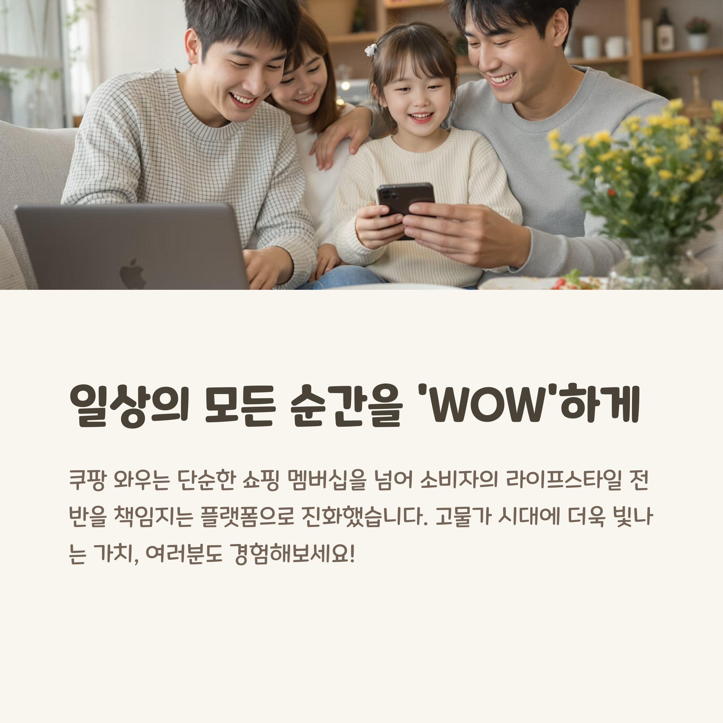 와우 회원은 쿠팡이츠 무료배달, 쿠팡플레이 무료 이용이 가능하여, 결합 서비스로 생활 전반에서 혜택을 누릴 수 있습니다.