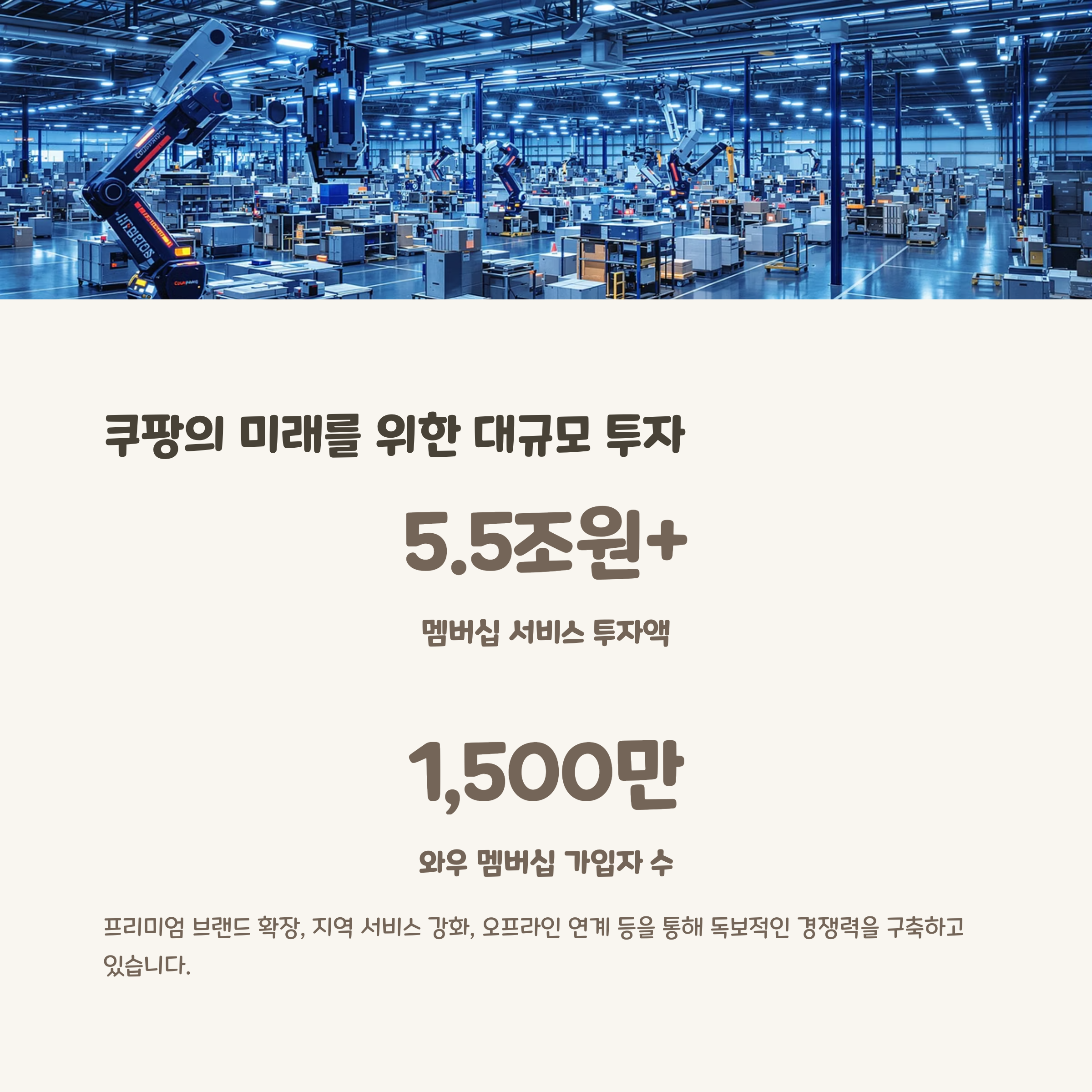 쿠팡은 멤버십 혜택 강화를 위해 5조 5천억 원이라는 대규모 투자를 집행했습니다. 쿠팡플레이는 월간 사용자 수 766만 명으로 국내 OTT 2위, 쿠팡이츠는 1,037만 명으로 배달앱 시장 2위에 올랐습니다. 쿠팡 앱의 전체 MAU도 3,211만 명을 넘어서며 플랫폼 전체가 상승세를 그리고 있습니다. 이처럼 결합 서비스의 시너지는 와우 멤버십의 유지율을 더욱 높이는 기반이 되고 있으며, 유통 시장 내 독주 체제를 공고히 하는 핵심 원동력입니다.
