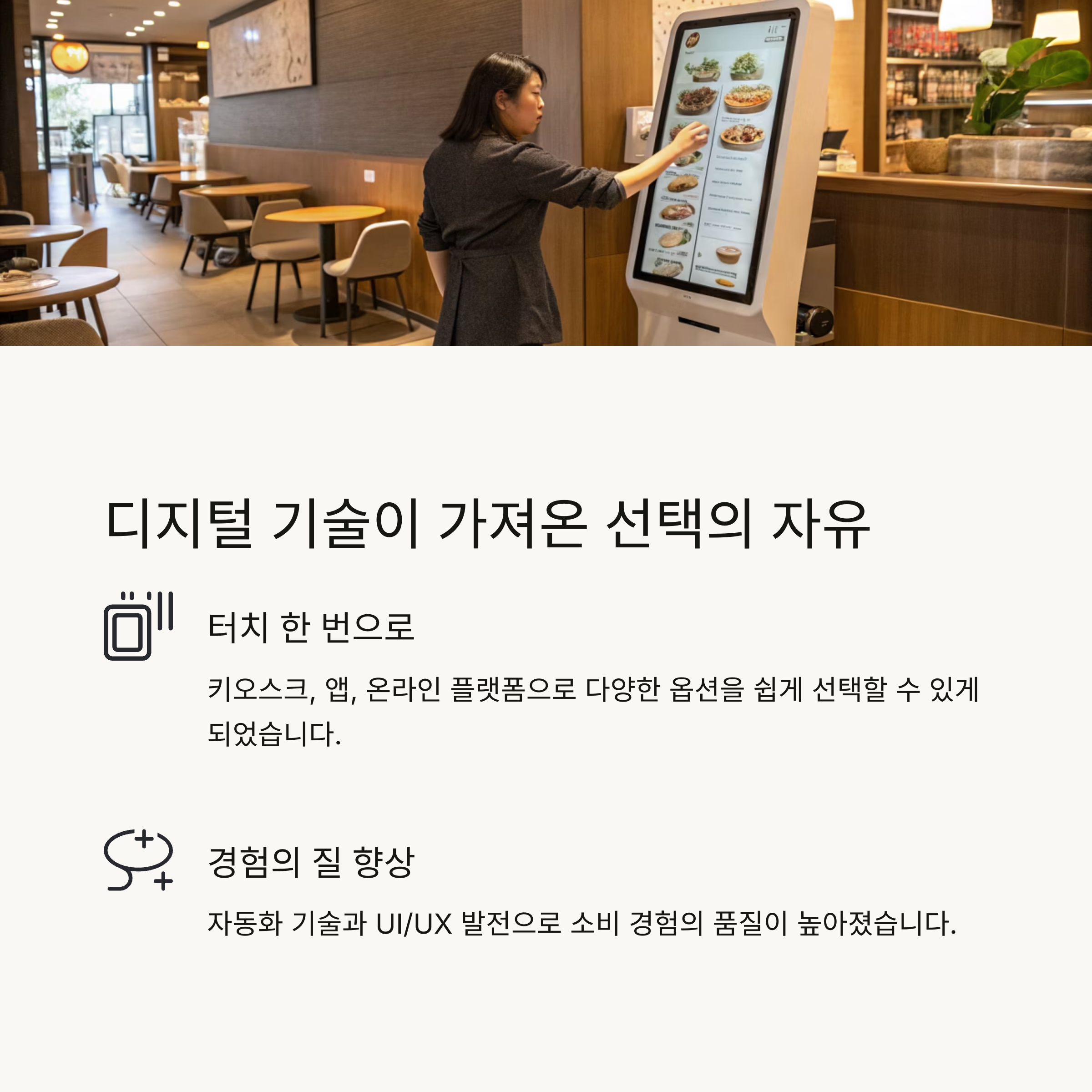 커스터마이징이 가능해진 배경에는 기술이 있습니다. 키오스크, 앱, 온라인 플랫폼을 통해 소비자는 몇 번의 터치만으로 다양한