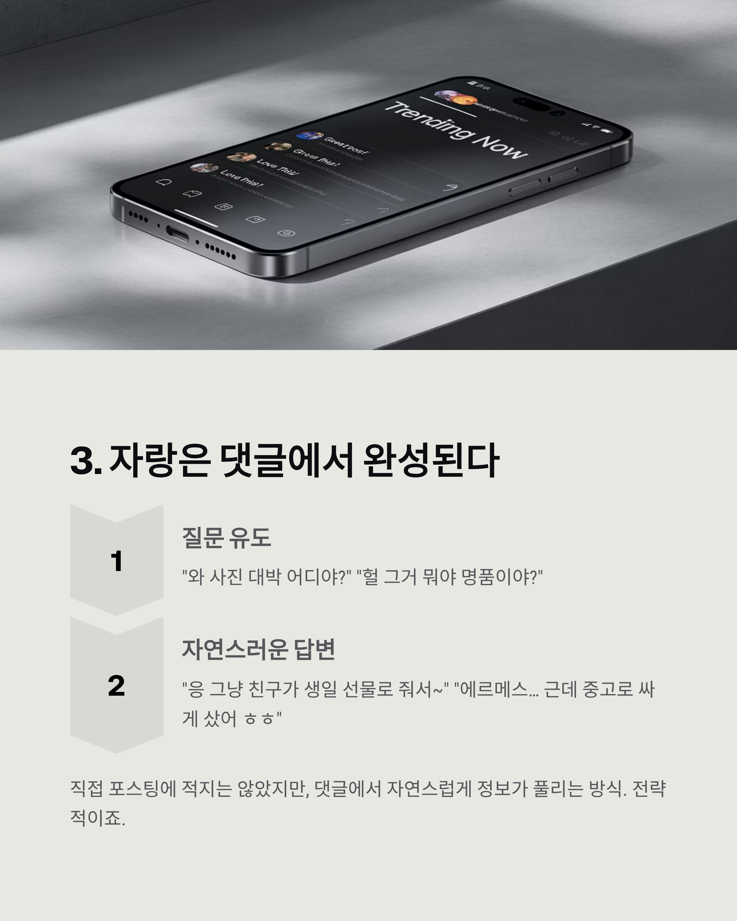 | 우연을 가장한 연출 | 댓글 활용, 비교 없는 자랑 |