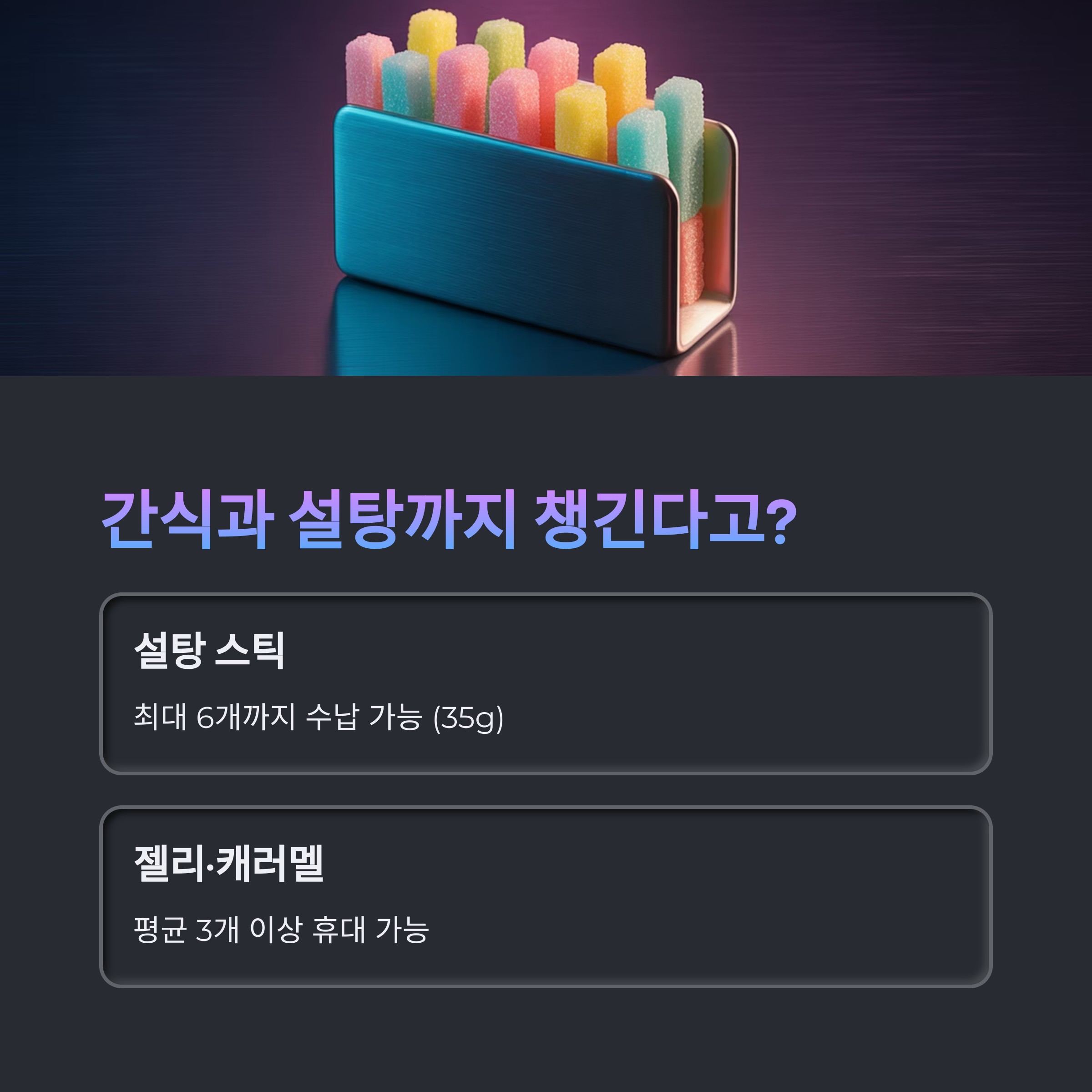 설탕 스틱, 젤리, 캐러멜 등 작지만 달콤한 간식들을 3개~6개까지 휴대할 수 있어