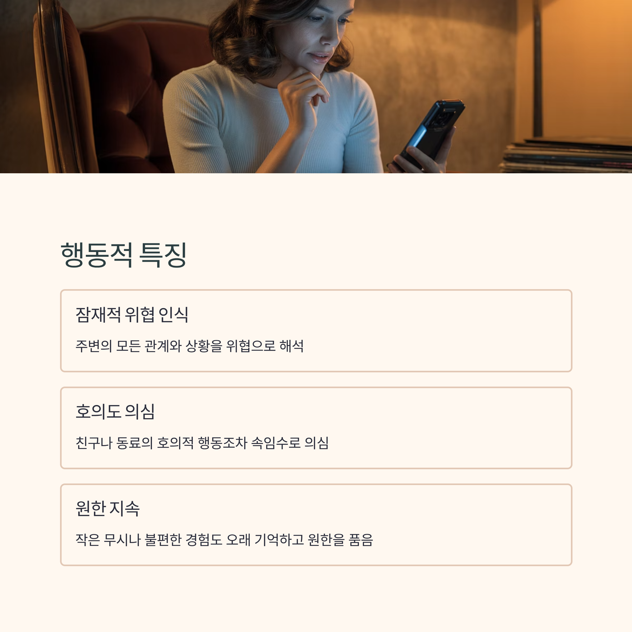 친구나 동료의 호의적인 행동조차 속임수로 의심하며, 일상적인 말투 속에서도 자신을 향한 비꼼이나 악의를 찾으려 합니다.
