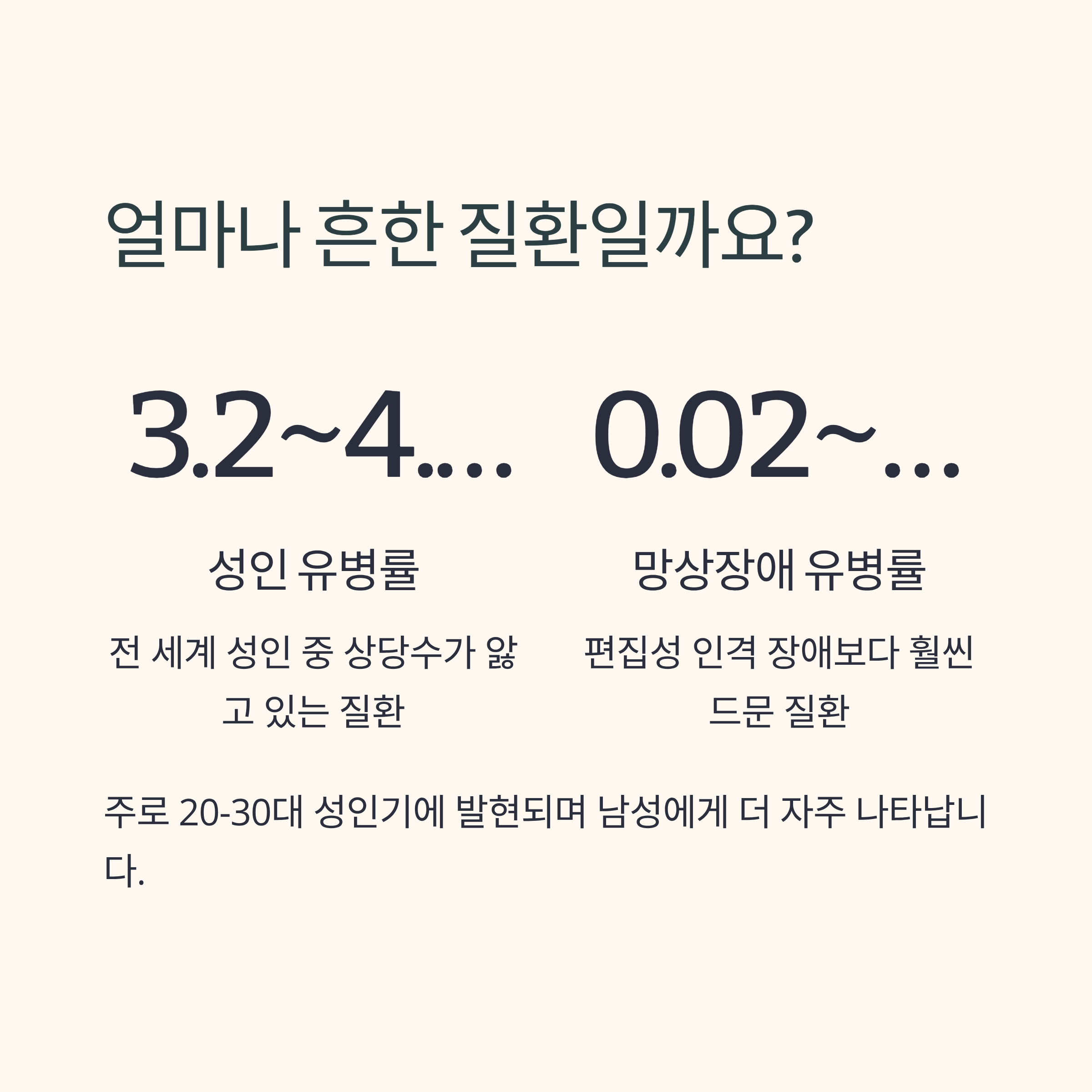 | 유병률 | 3.2%~4.4% | 전 성인 인구 기준 |