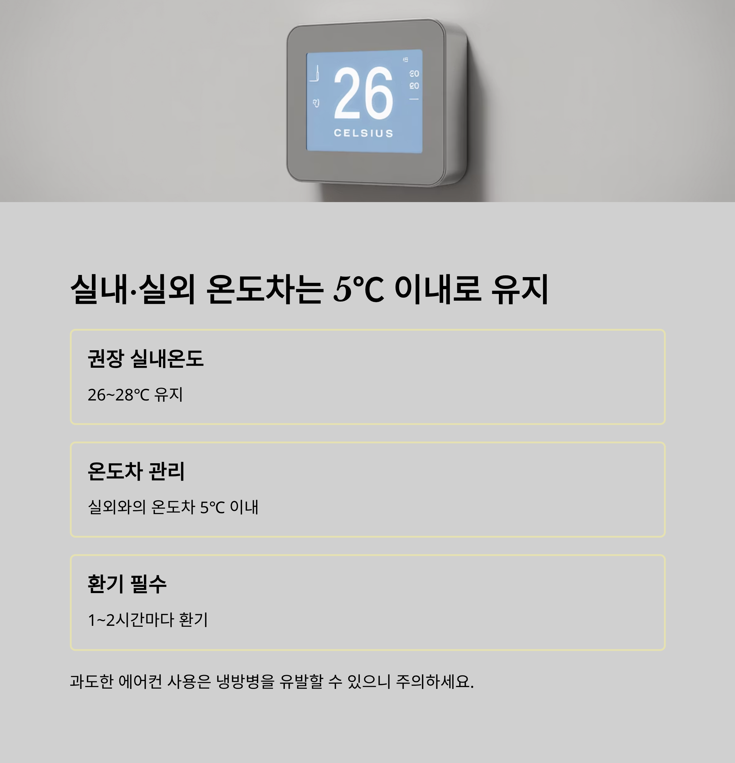 권장 실내온도는 26℃ ~28℃이며, 실외와의 온도차는 5℃를 넘지 않도록 유지하는 것이 좋습니다.