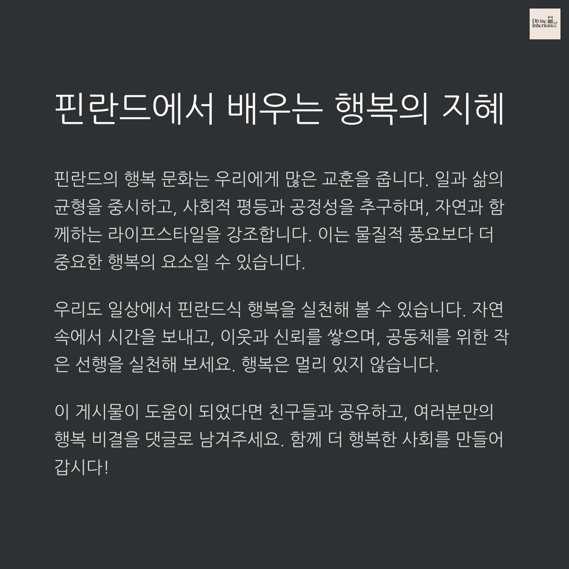 핀란드는 단순한 행복도가 높은 나라가 아니라, 행복을 하나의 사회적 철학으로 실현하고 있는 국가입니다. 이들의 일상은 자연과 함께하고, 복지 시스템은 모든 사람에게 기회를 제공하며, 공동체는 신뢰와 선의를 기반으로 유지됩니다. 이러한 요소들은 외적인 화려함보다 내면의 안정과 만족을 우선시하는 핀란드 사람들의 가치관을 반영합니다. 우리도 핀란드의 사례를 통해 개인과 사회 모두가 행복할 수 있는 길을 고민해 볼 수 있겠습니다.