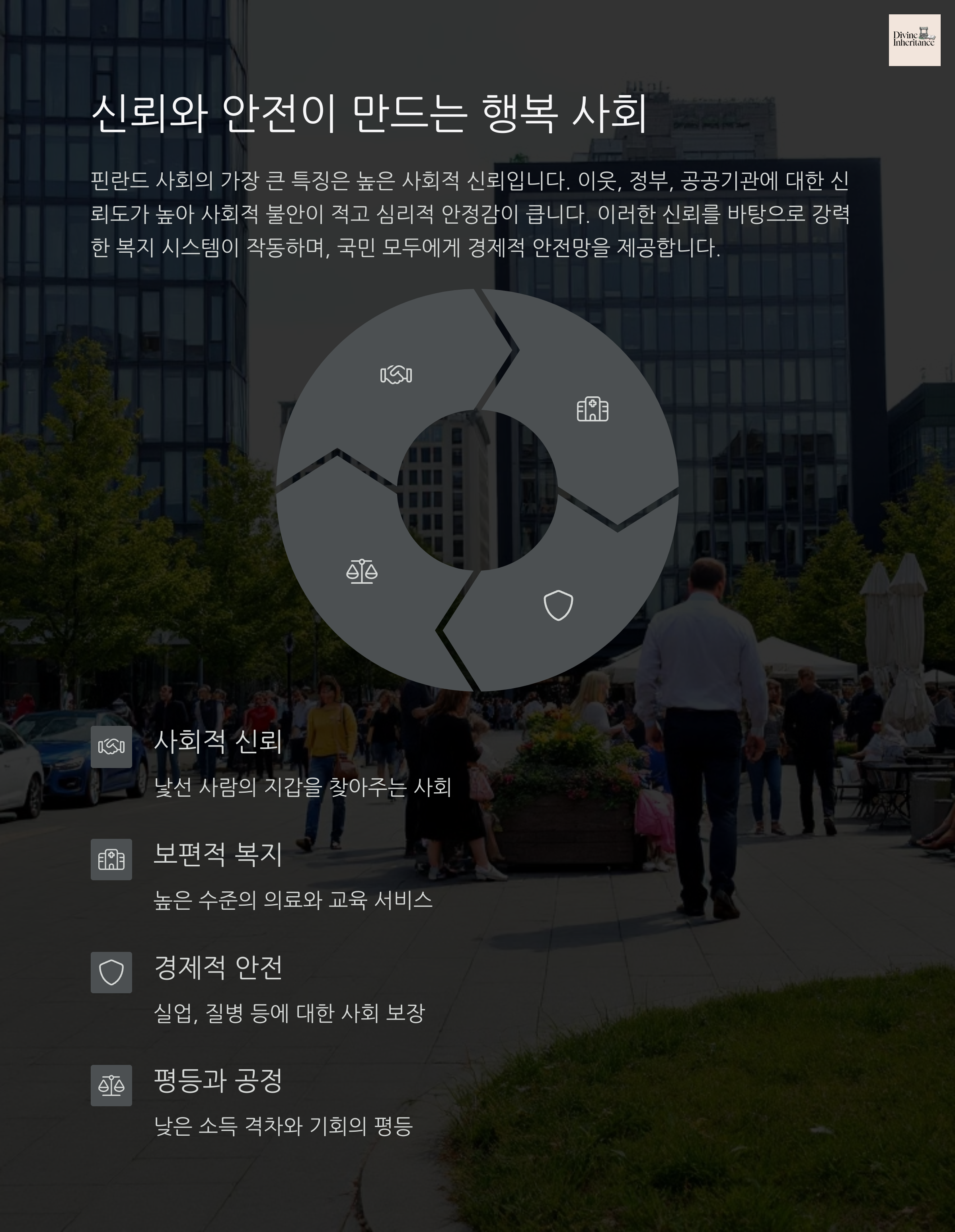 | 이웃 간 신뢰, 기관 신뢰도가 매우 높음 | 숲과 호수 등 자연환경 속 삶의 조화 | 교육, 의료, 실업 등 국가의 책임 보장 |