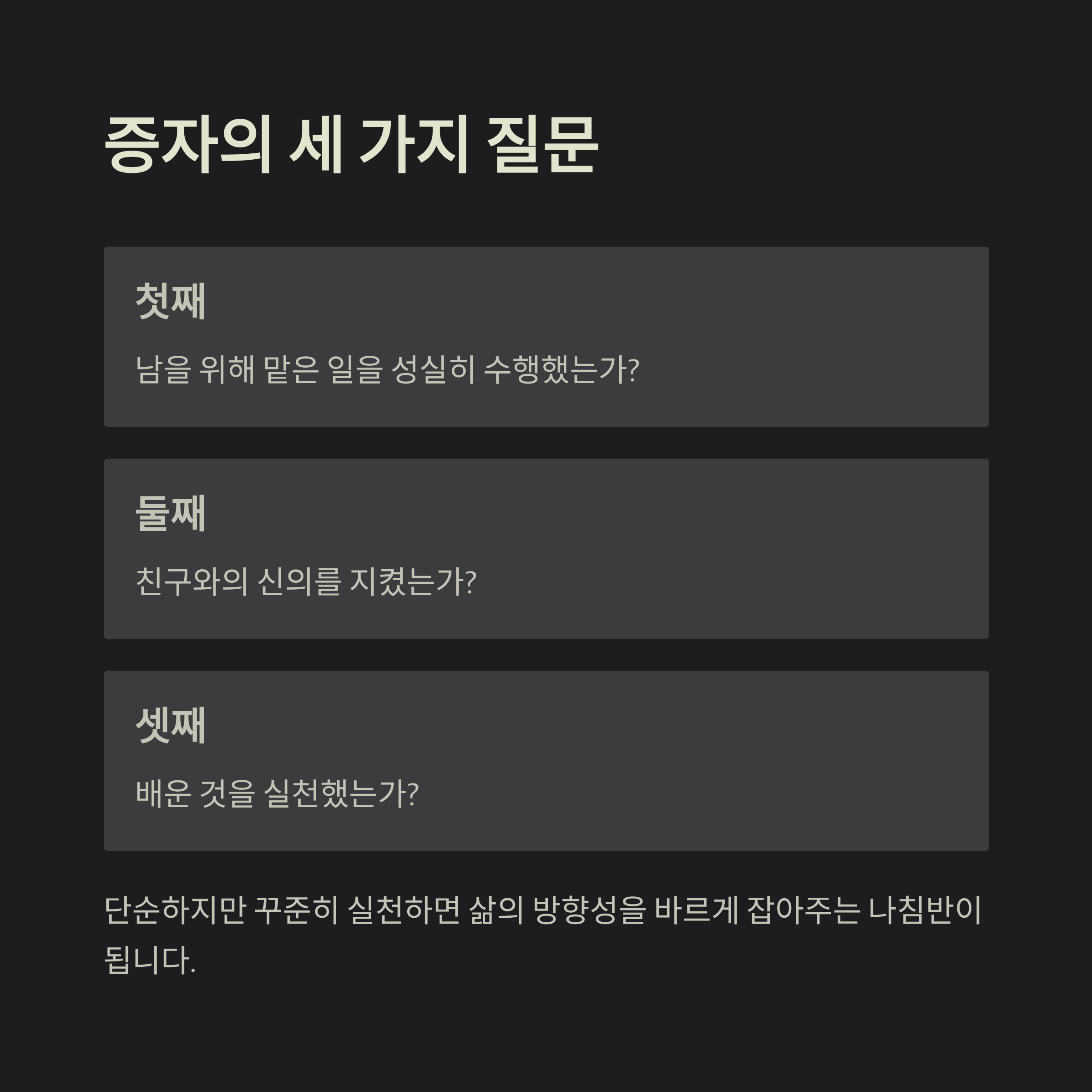 이 질문들은 단순하지만, 꾸준히 실천하면 삶의 방향성을 바르게 잡아주는 나침반이 됩니다.