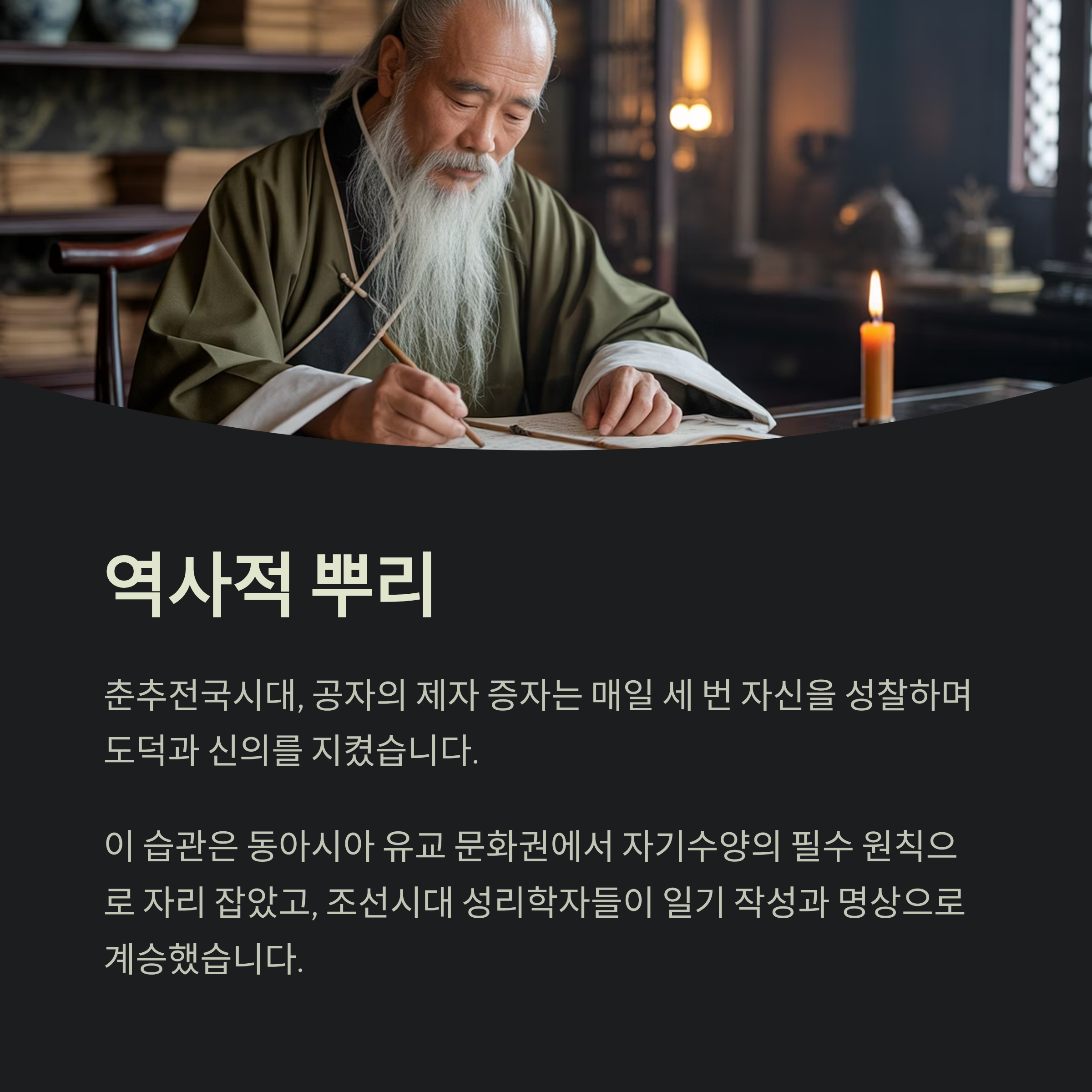 이 습관은 이후 동아시아 유교 문화권에서 자기수양의 필수 원칙으로 자리 잡았고, 조선시대 성리학자들은