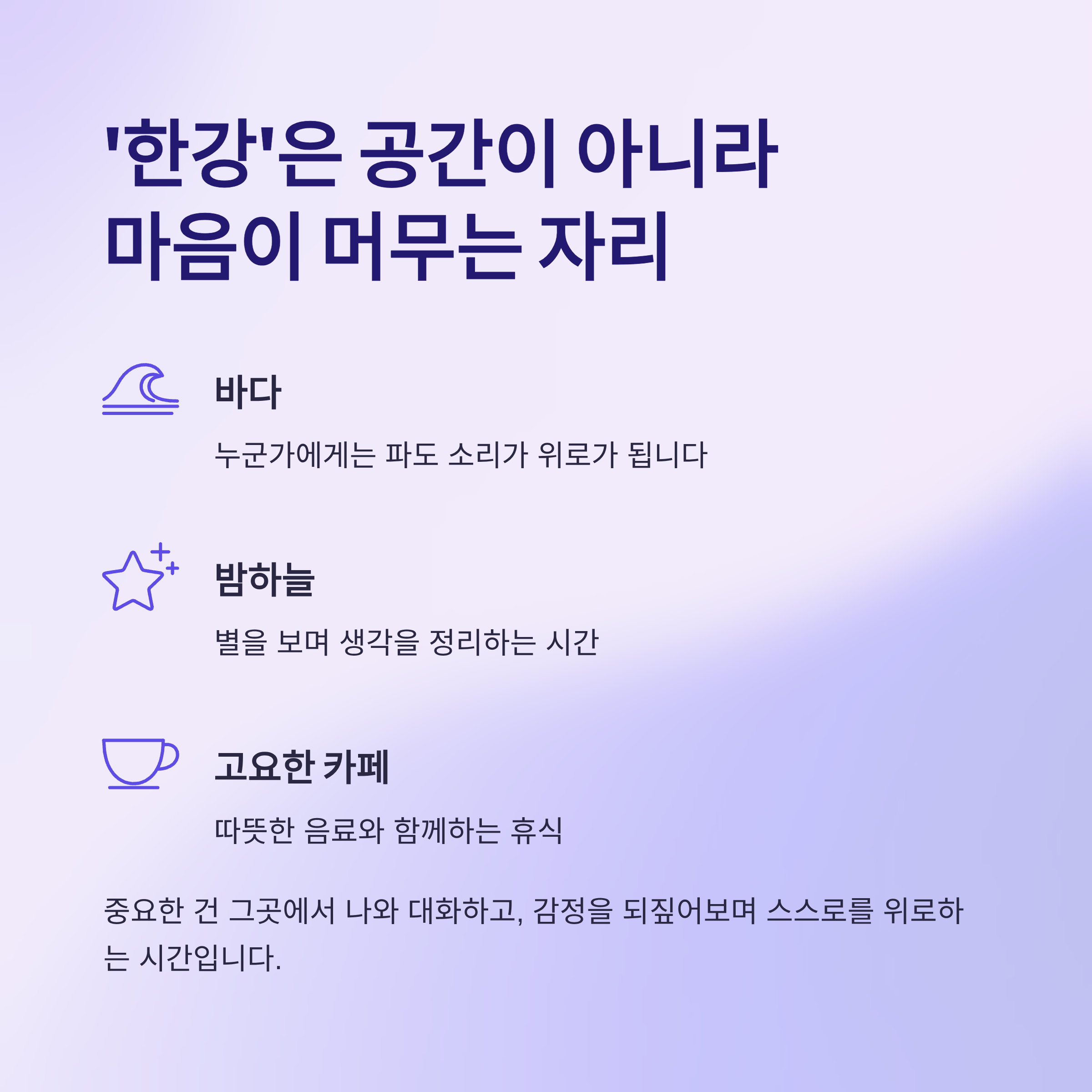 | 공간 개념 | '한강' = 마음의 쉼터 | 각자에게 필요한 내면의 휴식 공간 찾기 |