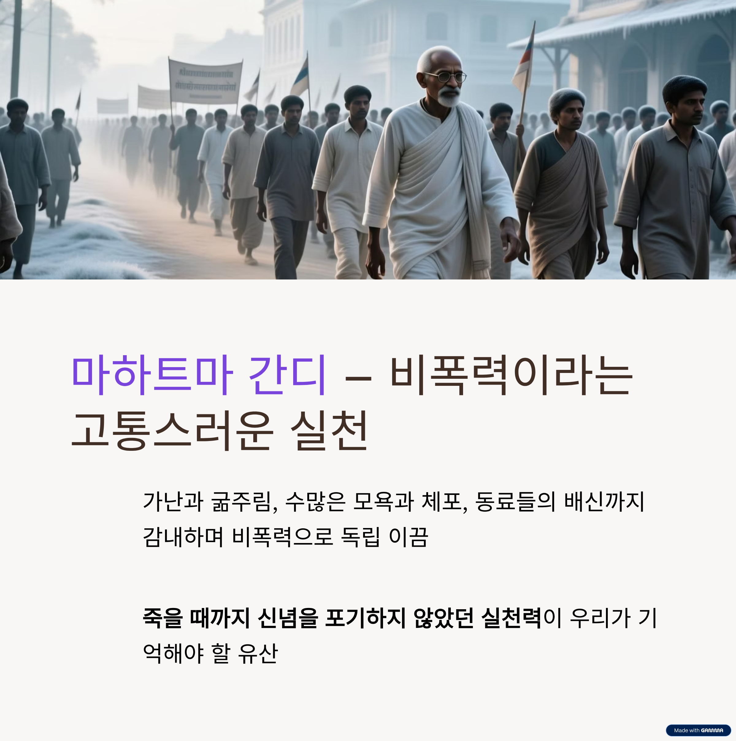 가난과 굶주림, 수많은 모욕과 체포, 심지어는 동료들의 배신까지. 그 모든 것을 감내하면서도 그는 끝까지 폭력 없이 독립을 이끌었습니다.