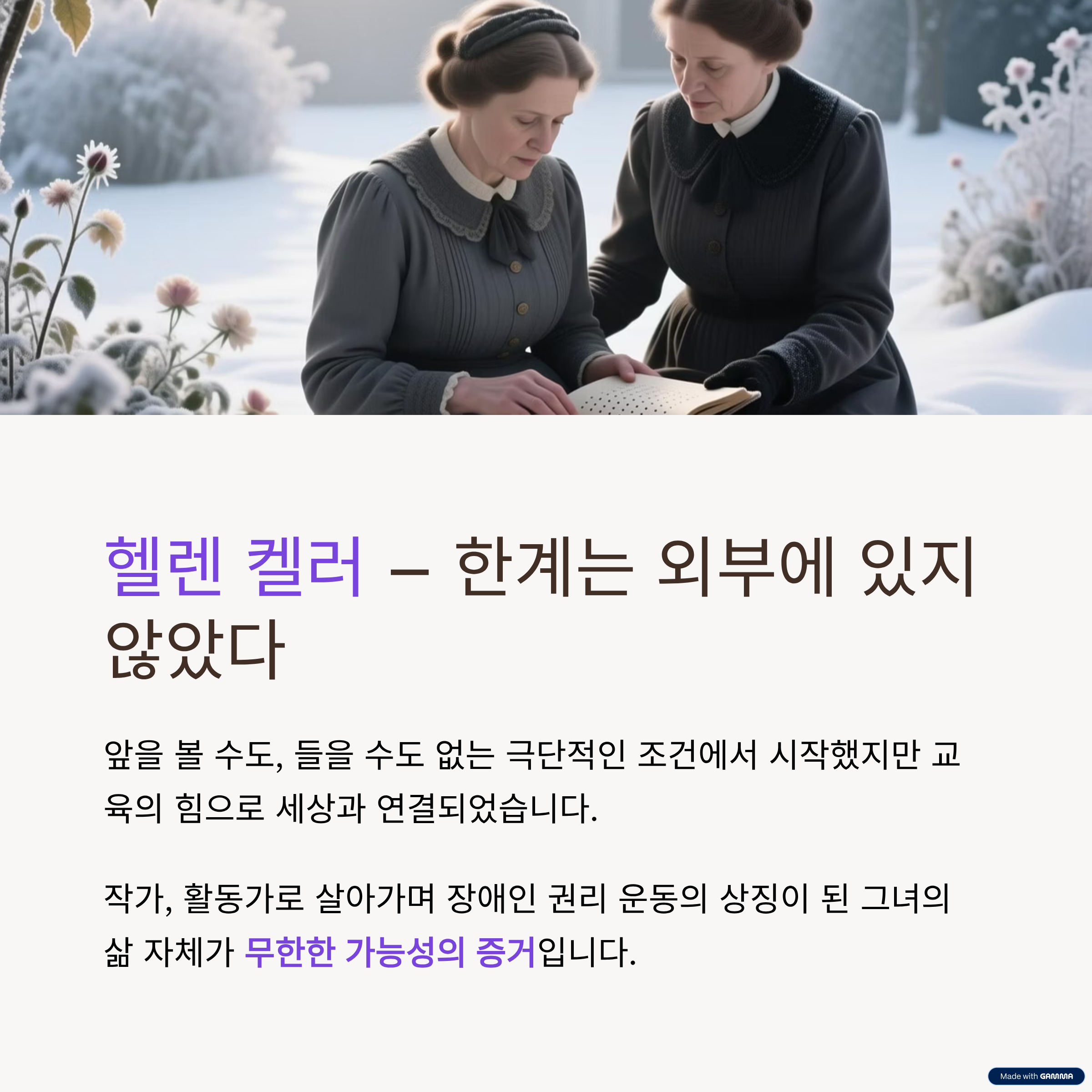 하지만 그녀는 교육의 힘으로 세상과 연결되었고, 작가, 활동가로 살아가며 장애인 권리 운동의 상징이 되었습니다. 단순히 “당신의 한계를 믿지 마라” 같은 명언보다,