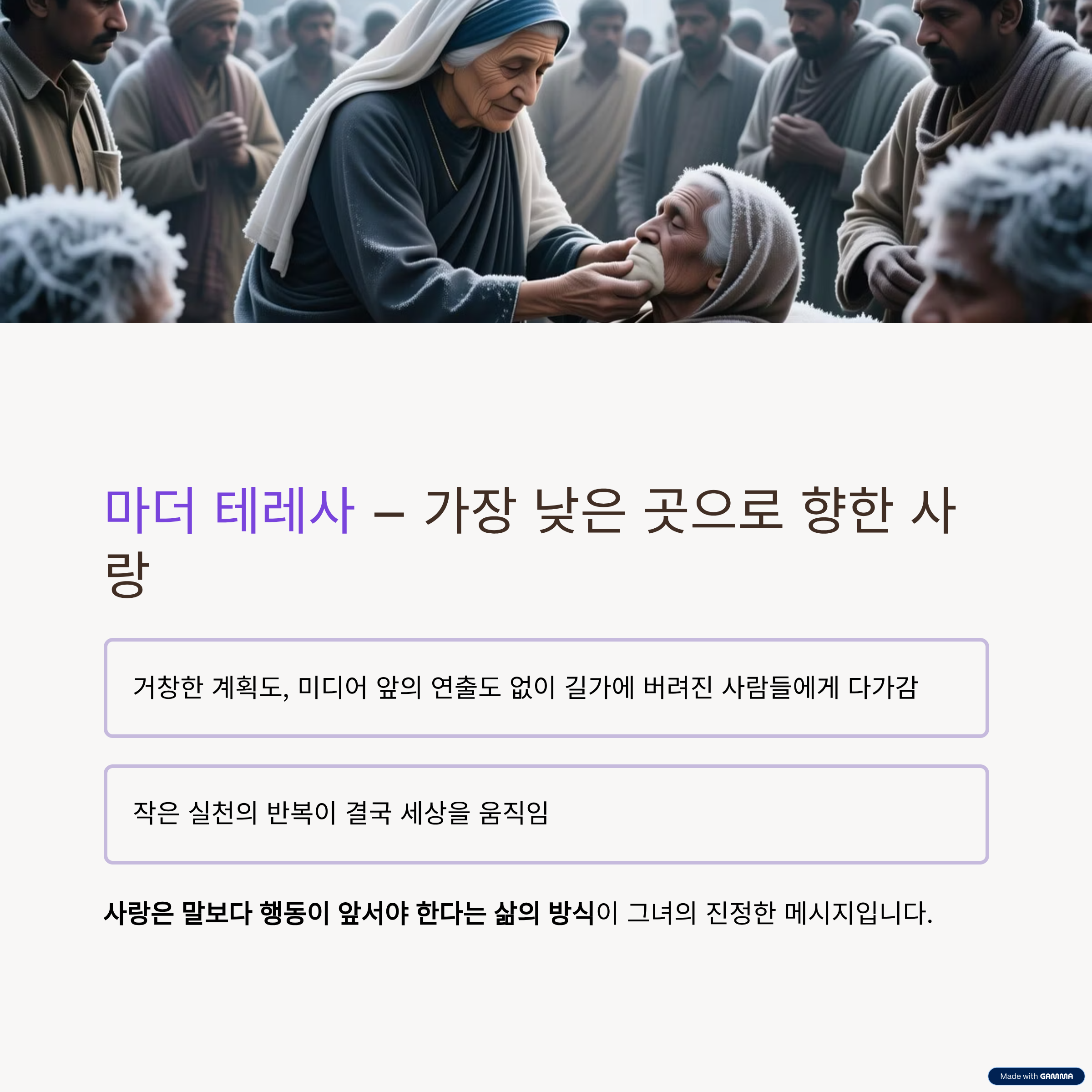 그녀는 그냥 길가에 버려진 사람들에게 다가가 손을 잡고, 닦아주고, 함께 울었습니다. 작은 실천의 반복이 결국 세상을 움직였죠.