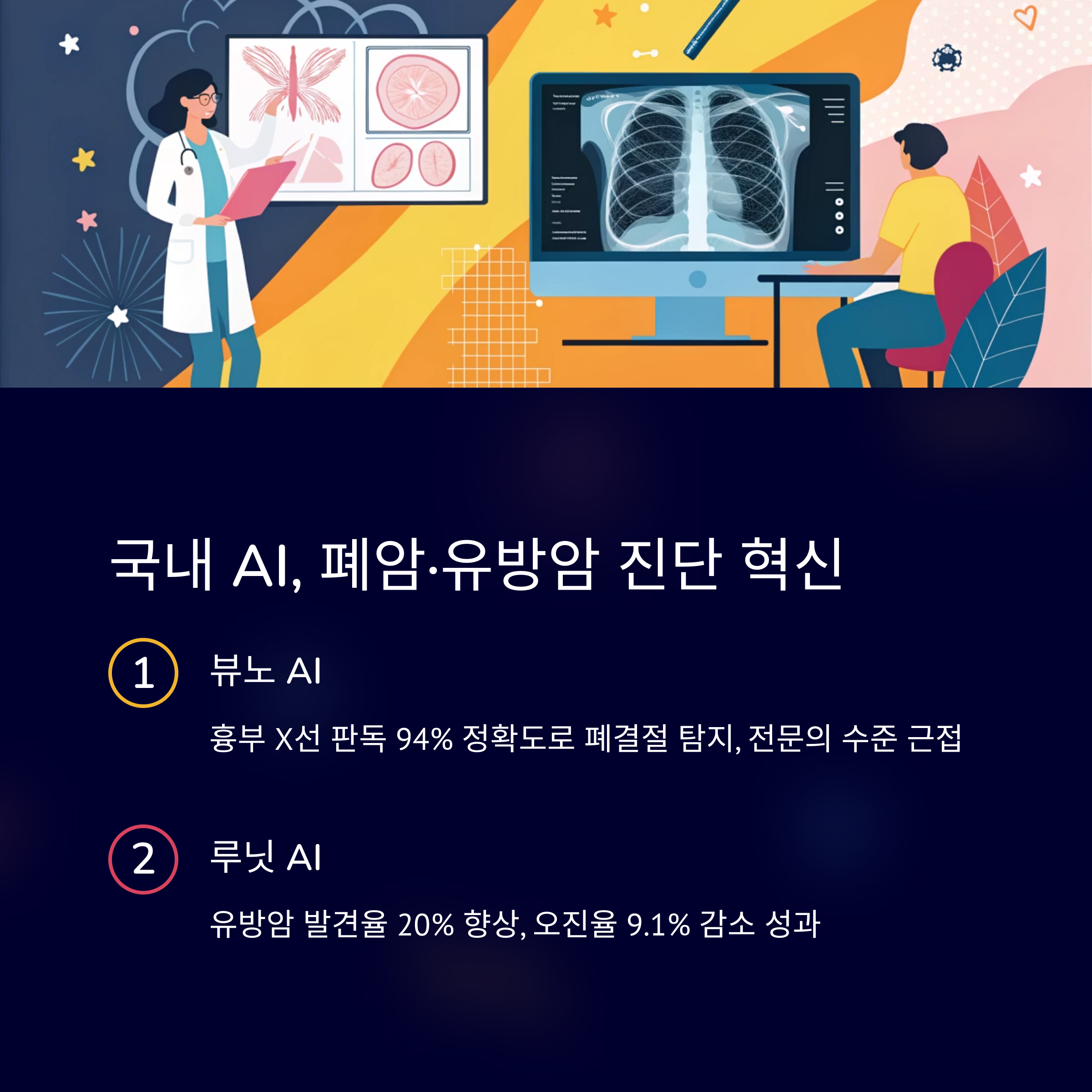 뷰노의 흉부 X선 AI는 폐결절을 94% 정확도로 탐지하며 전문의 수준에 근접했으며, 루닛의 유방암 AI는 기존