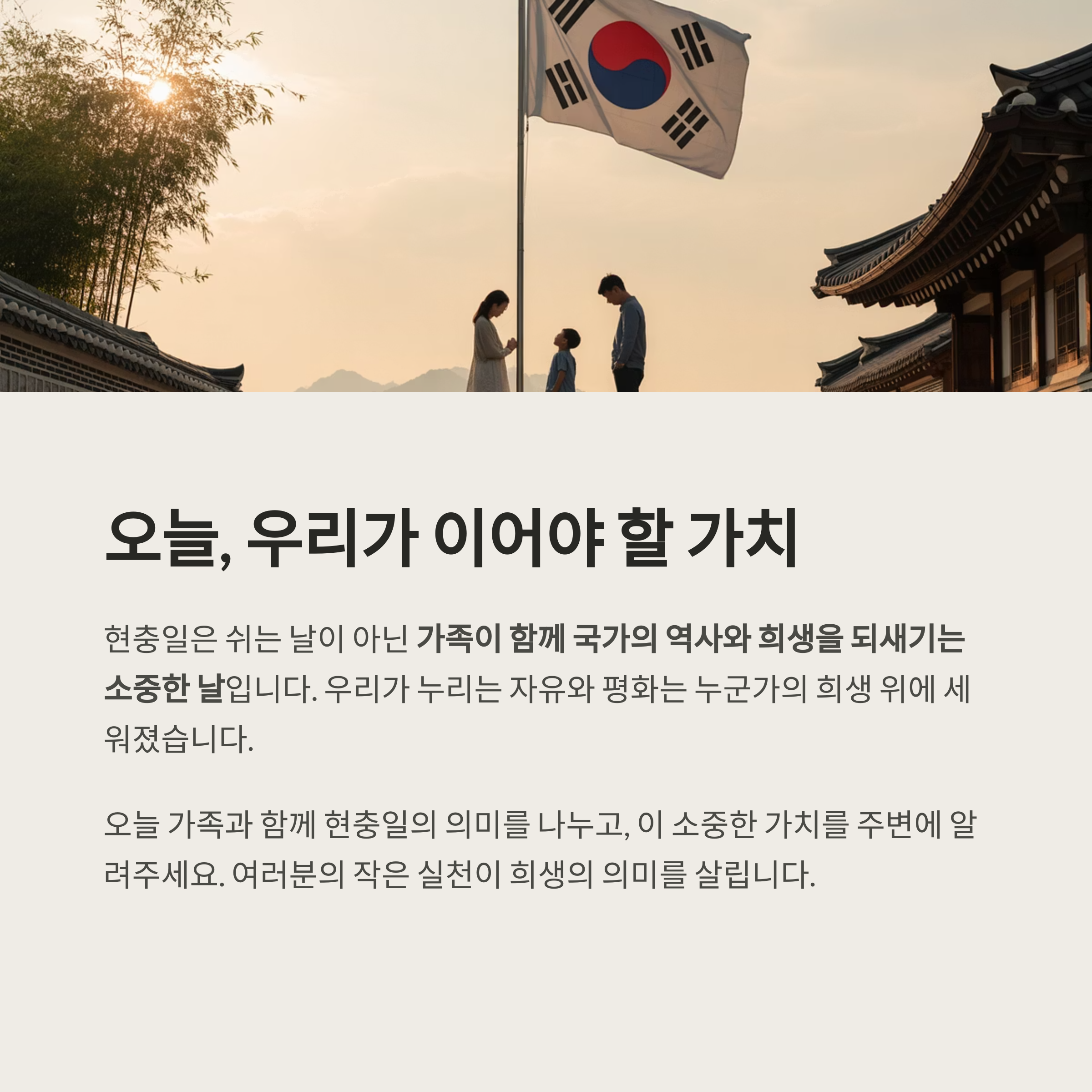 대한민국을 위해 목숨을 바친 이들의 숭고한 희생을 기리는 현충일은, 단지 공휴일이 아니라 가족과 함께 역사적 의미를 되새기는 날입니다. 이 날을 통해 우리 모두가 자유와 평화의 가치를 되새기고, 세대 간 소통과 공감을 이어가는 것이 중요합니다.