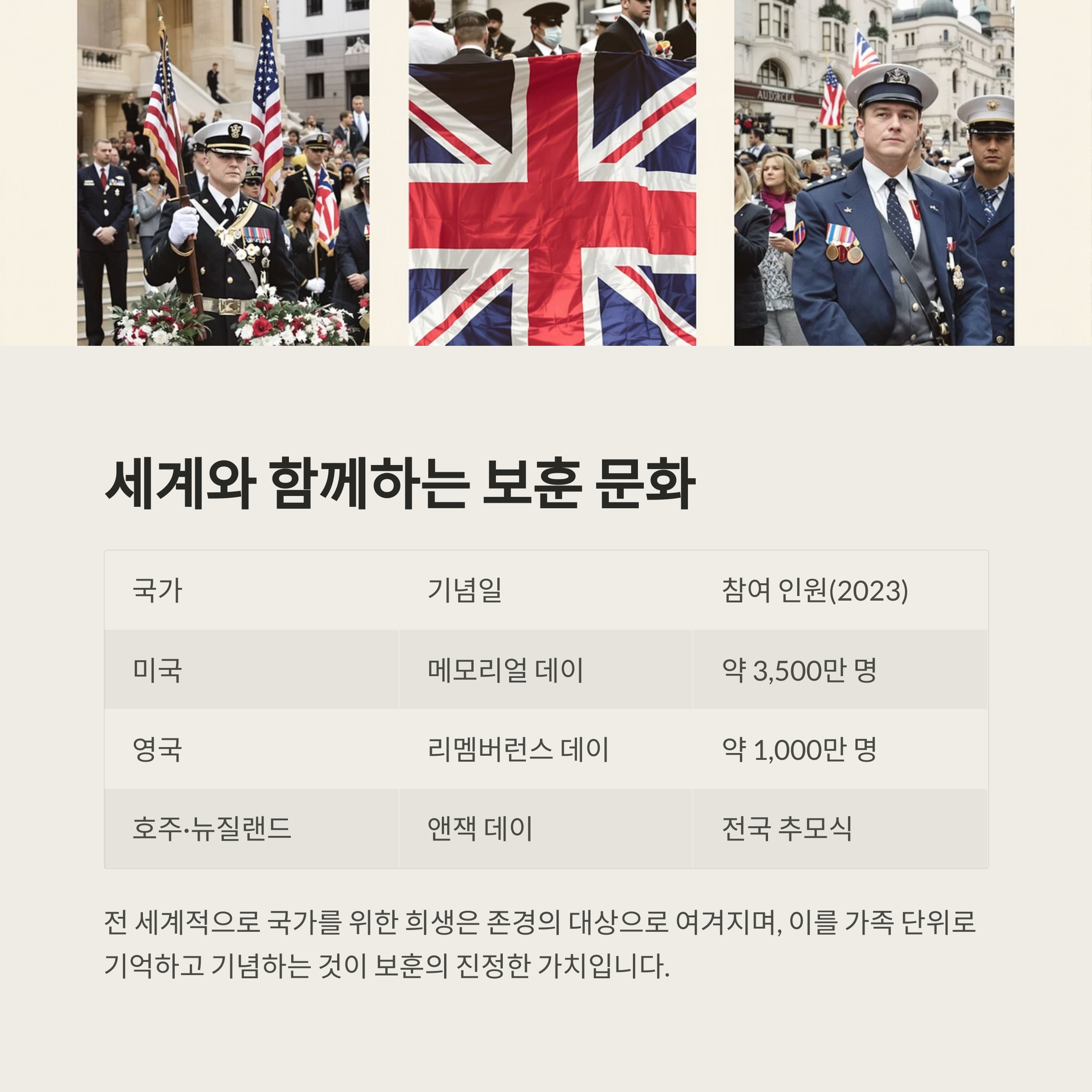 세계 각국도 현충일과 유사한 기념일을 운영하며, 국가에 헌신한 이들을 예우합니다.