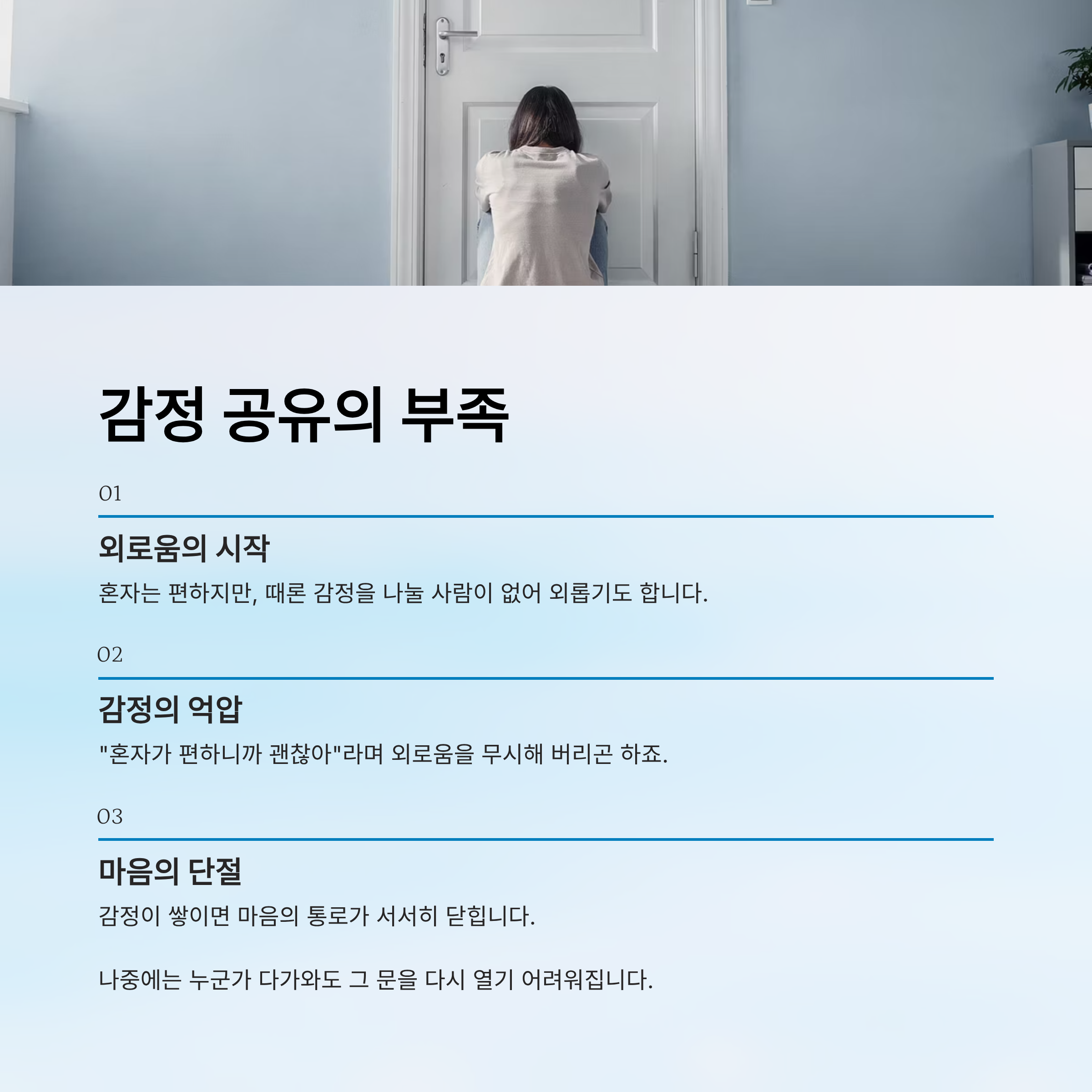그런데 감정이 해소되지 않고 쌓이면, 마음의 통로가 서서히 닫힙니다. 나중에는 누군가 다가와도 그 문을 다시 열기 어려워집니다.