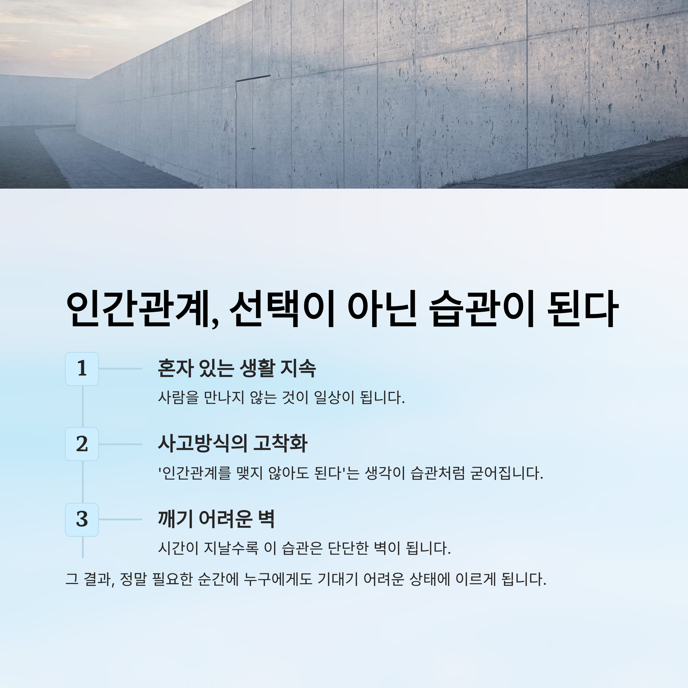 이 습관은 시간이 지날수록 깨기 어려운 벽이 됩니다. 그 결과, 정말 필요한 순간에 누구에게도 기대기 어려운 상태에 이르게 됩니다.
