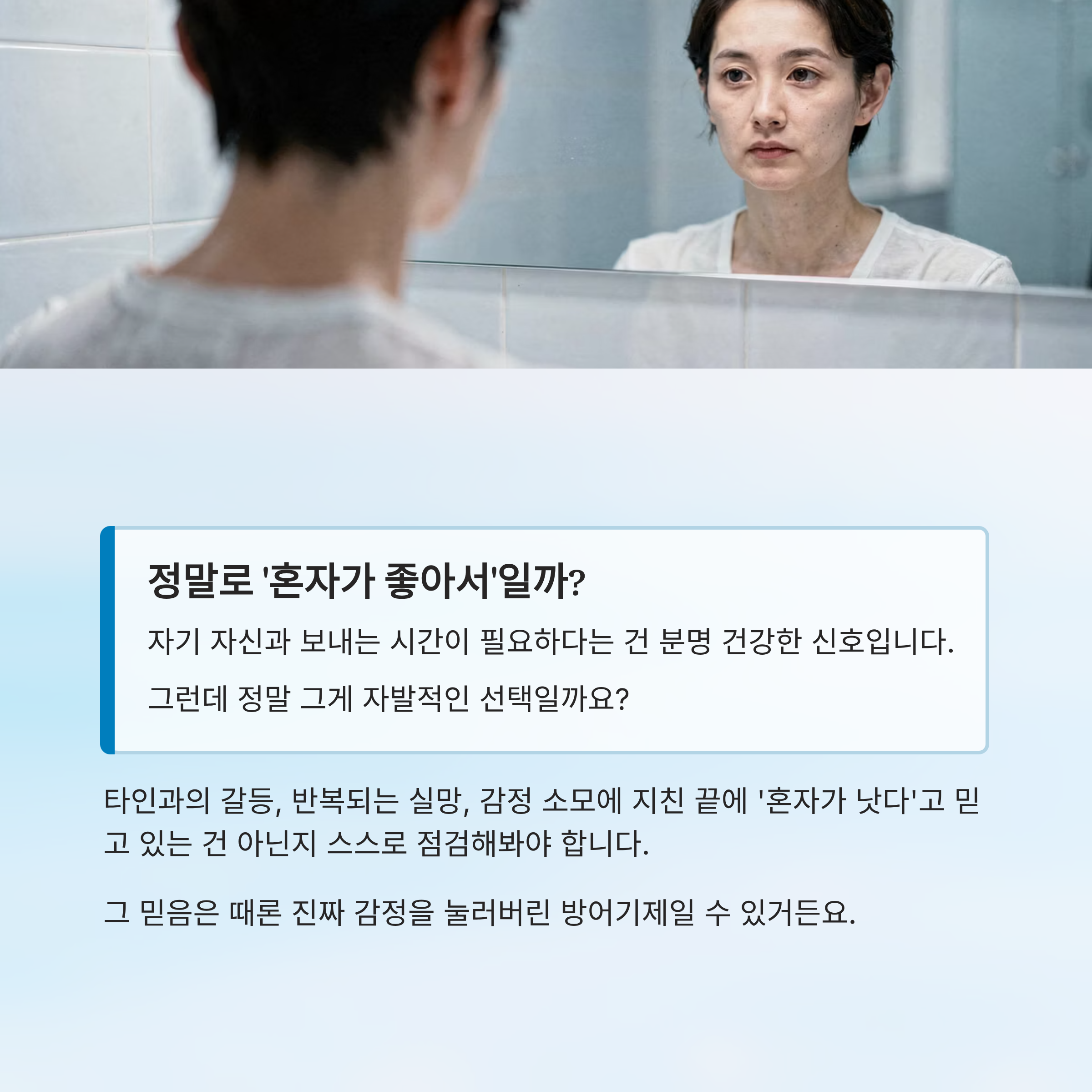 혼자 있는 시간이 길수록, 그 거울을 외면하게 되며 자기 객관화가 어려워질 수 있습니다.