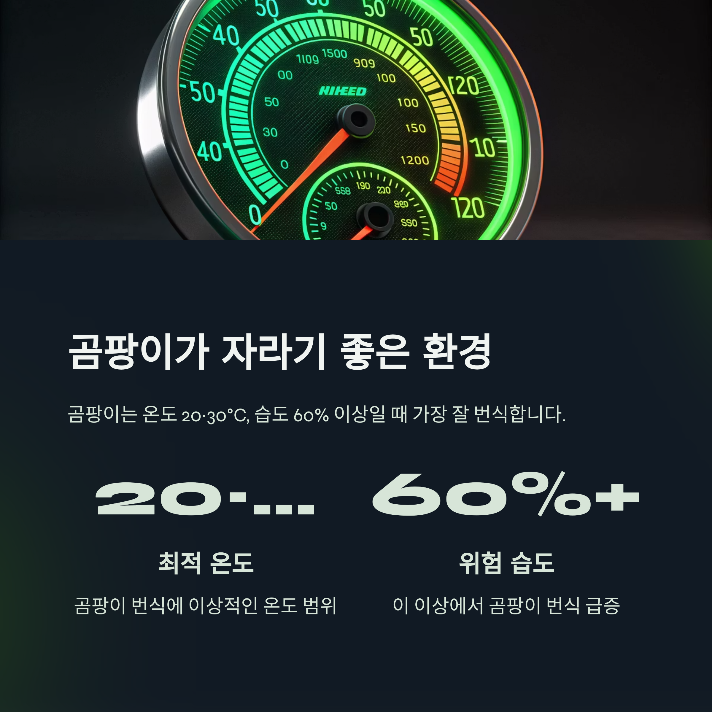 곰팡이는 온도 20°C ~30°C, 습도 60% 이상일 때 가장 잘 번식합니다.