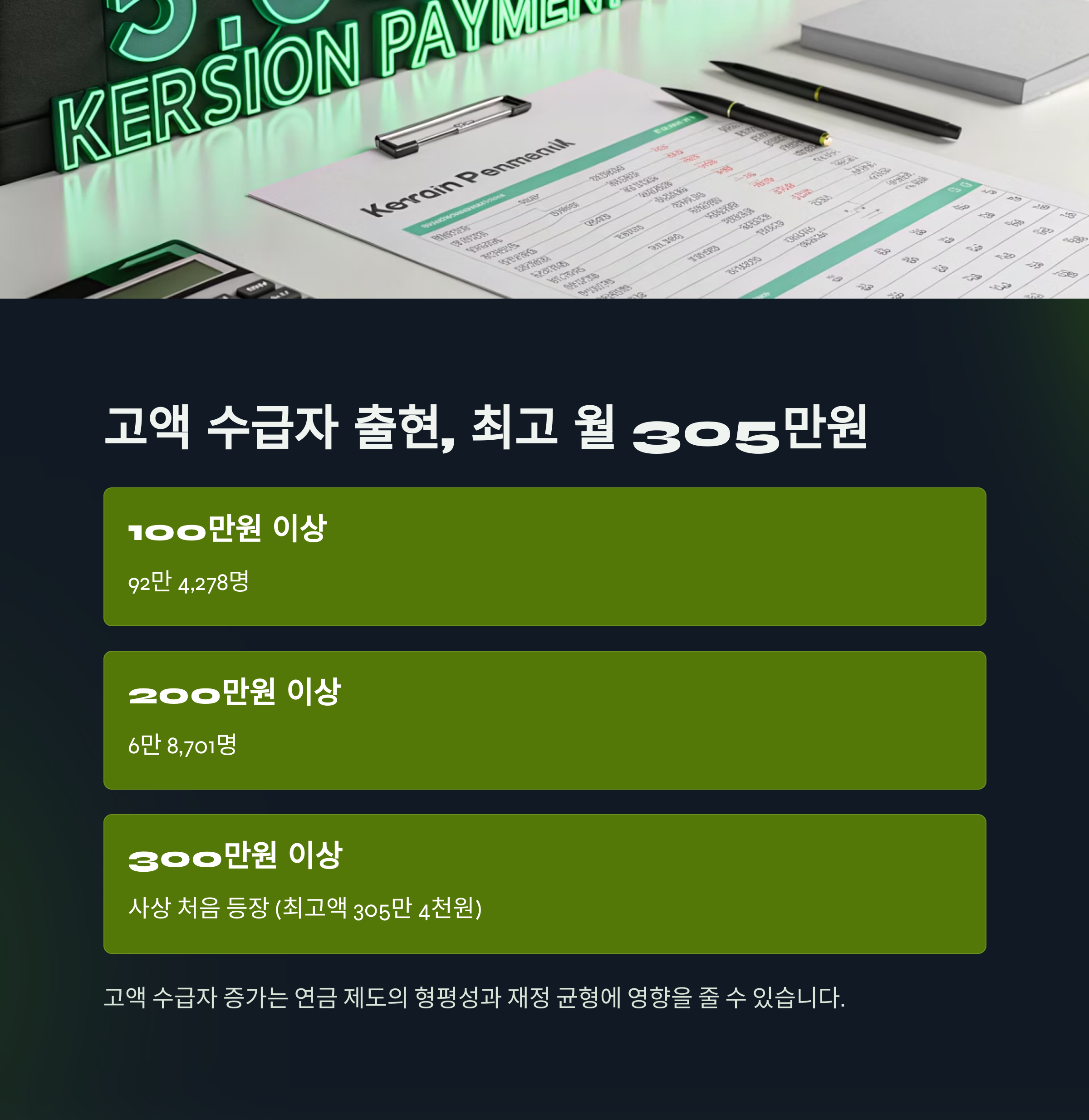 이와 같은 고액 수급자 증가도 연금 제도의 형평성과 재정 균형에 영향을 줄 수 있습니다.