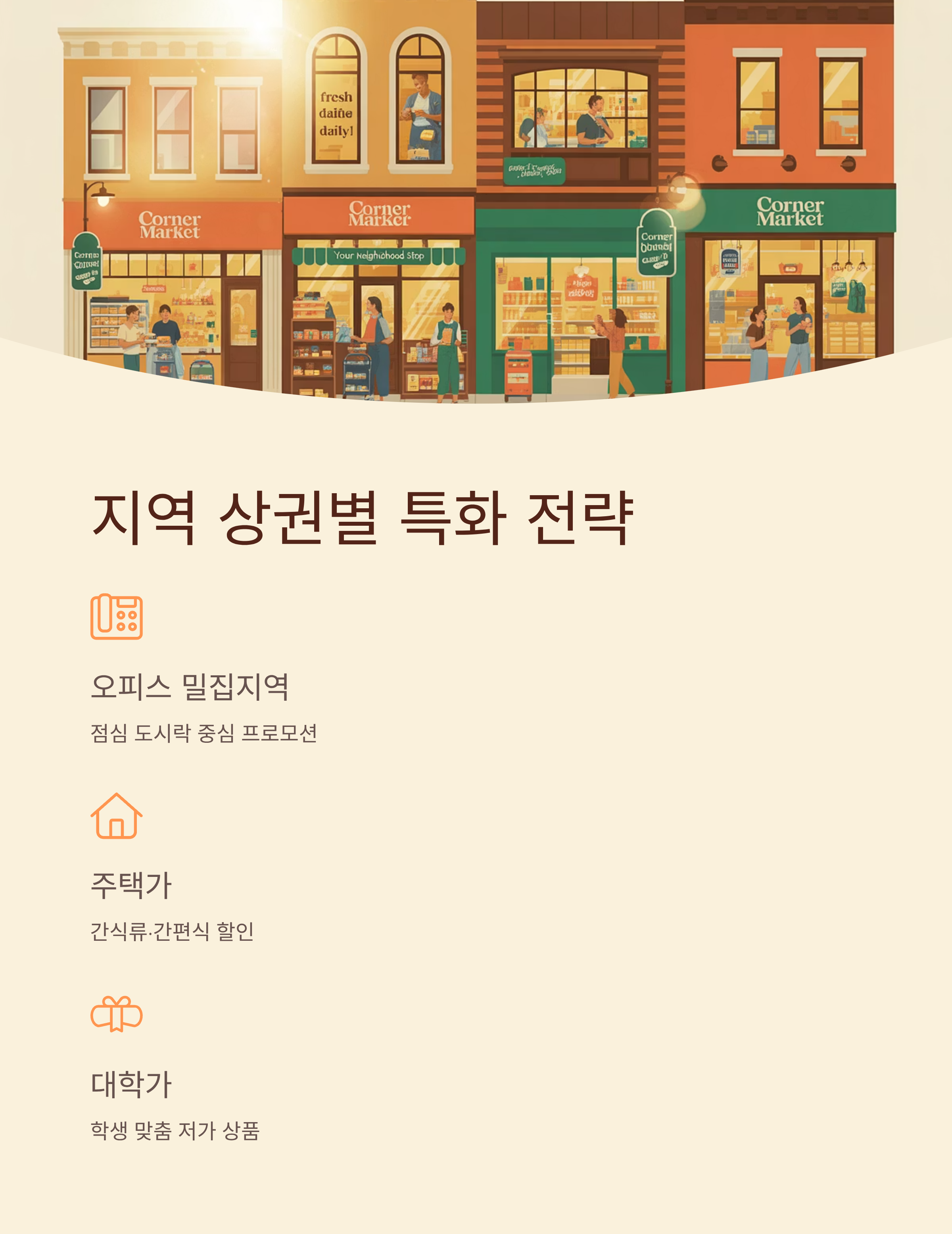 지역별로 인기 품목과 수요가 다른 만큼, 상권별 특화 전략도 강화되고 있습니다. 예를 들어 오피스 밀집 지역은 점심 도시락 중심, 주택가나 대학가 주변은 간식류와 간편식 중심으로 프로모션이 구성됩니다.