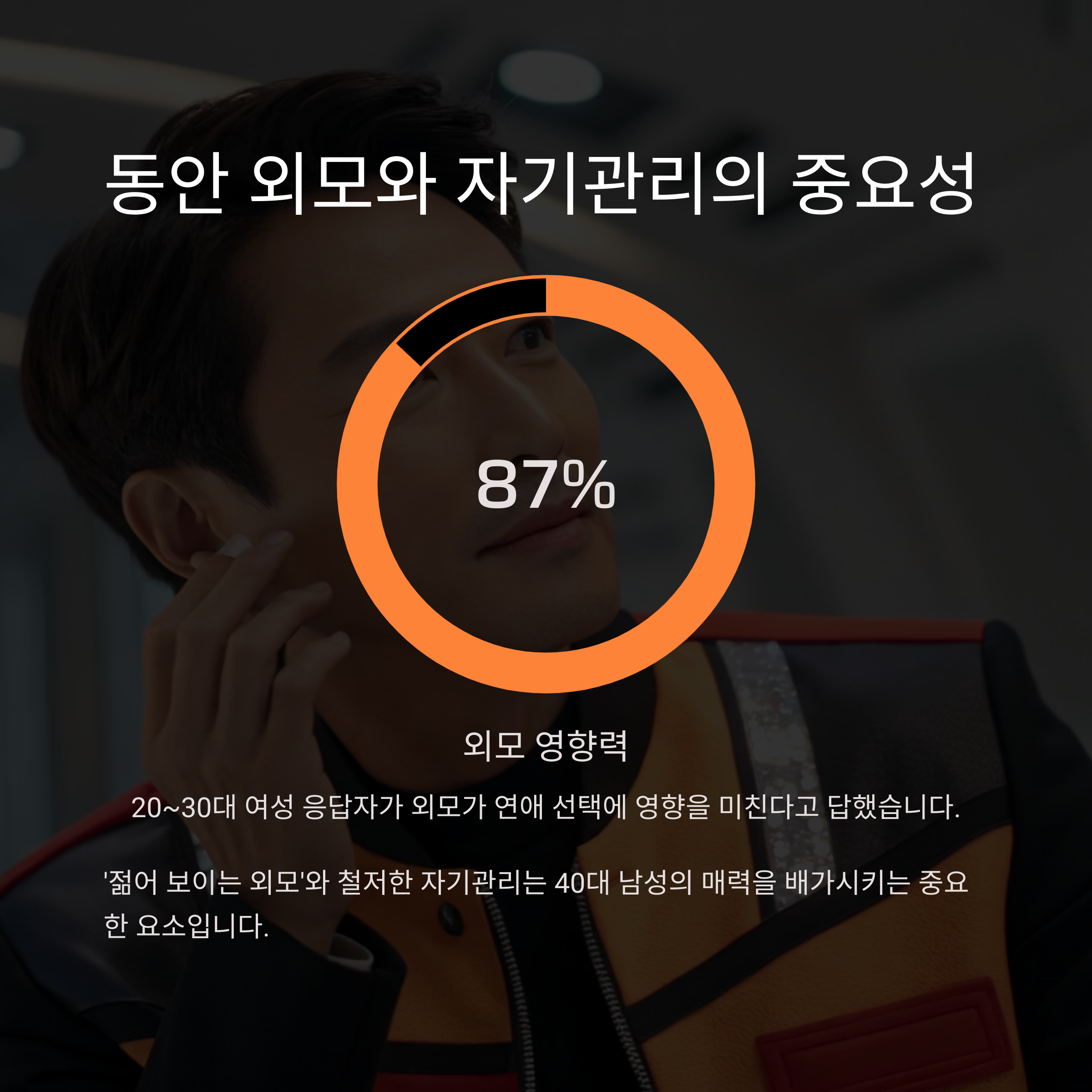 그 중에서도 ‘젊어 보이는 외모’는 40대 남성의 매력을 배가시키는 중요한 요인으로 작용합니다.