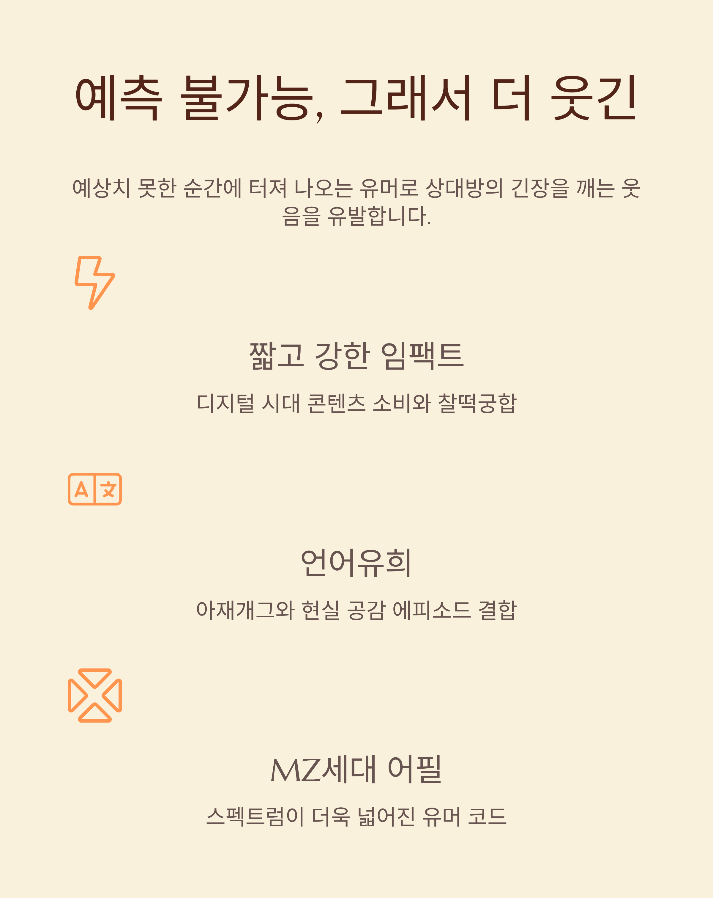 언어유희, 아재개그, 현실 공감형 에피소드 등이 결합되며 그 스펙트럼은 더욱 넓어졌습니다.