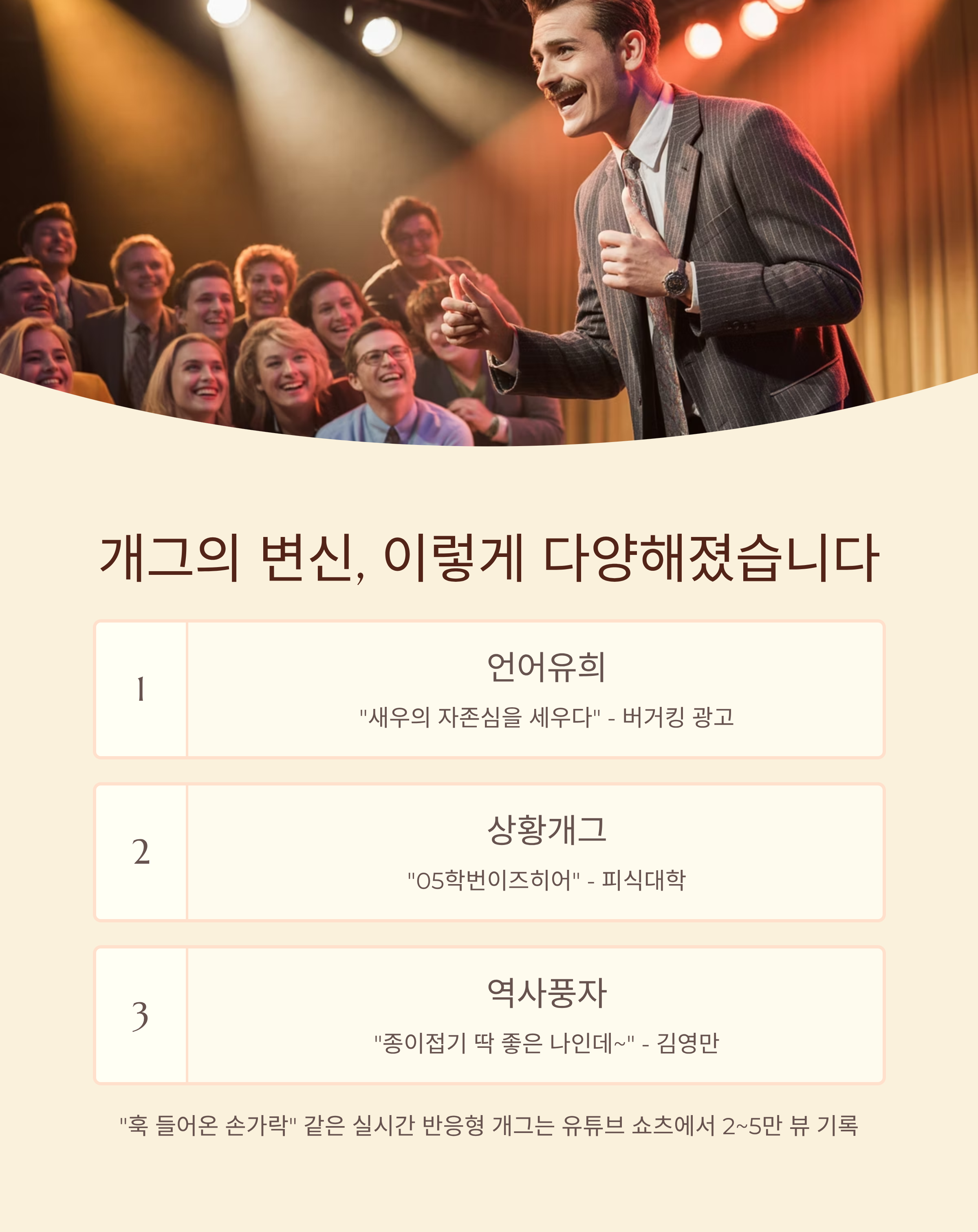 2025년, 대한민국 개그 트렌드는 완전히 새로운 장을 열고 있습니다. 바로 '갑자기 훅 들어온 개그'가 그 중심에 있는데요. 이 스타일은 유튜브, 방송, 광고 등 모든 디지털 콘텐츠에서 MZ세대의 강력한 지지를 받으며 폭발적인 반응을 끌어내고 있습니다. 이 글에서는 2025년 현재 데이터를 바탕으로 이 개그 스타일이 어떤 방식으로 퍼지고 있는지, 어떤 유형이 인기인지, 그리고 사회적 영향까지 낱낱이 살펴보겠습니다.