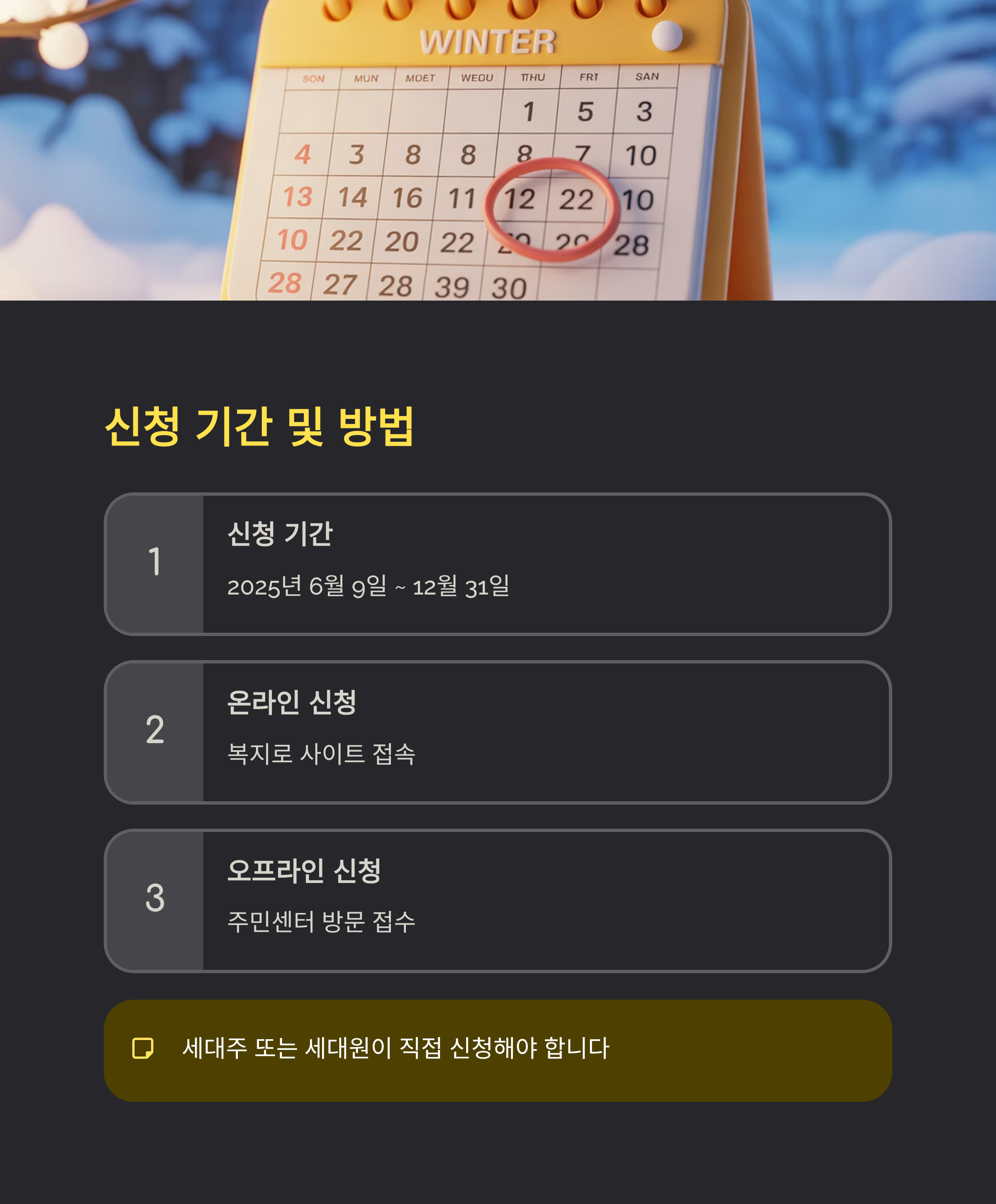 단, 신청은 반드시 세대주 또는 세대원이 직접 해야 하며, 대리 신청 시 위임장이 필요할 수 있습니다.