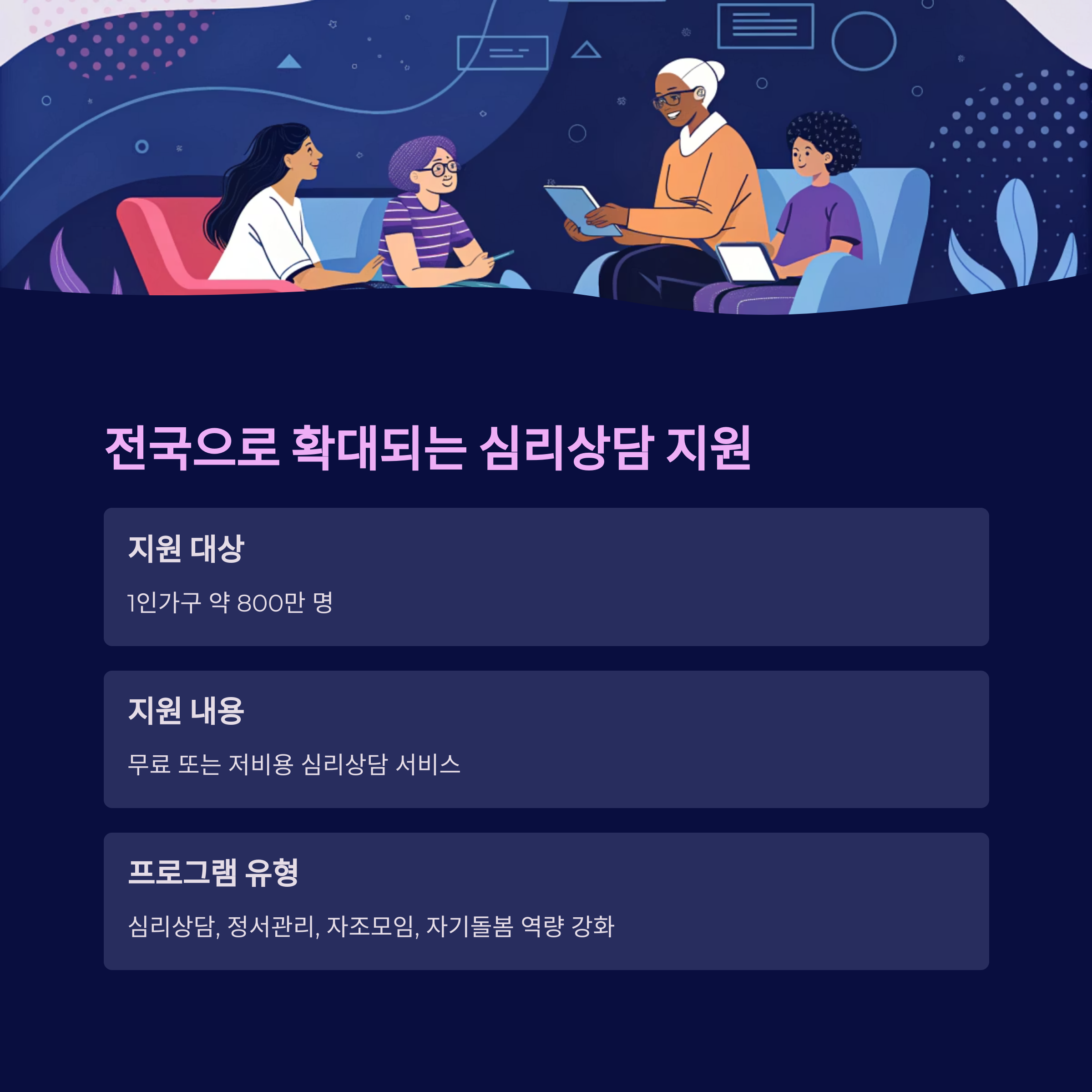 | 성남시 | 힐링스페이스(차의과학대학교 연계) | 개별·집단상담 | 8회 무료, 이후 10% 자부담 | 전화/방문 신청 | 성남 1인가구 (13만1096가구) |