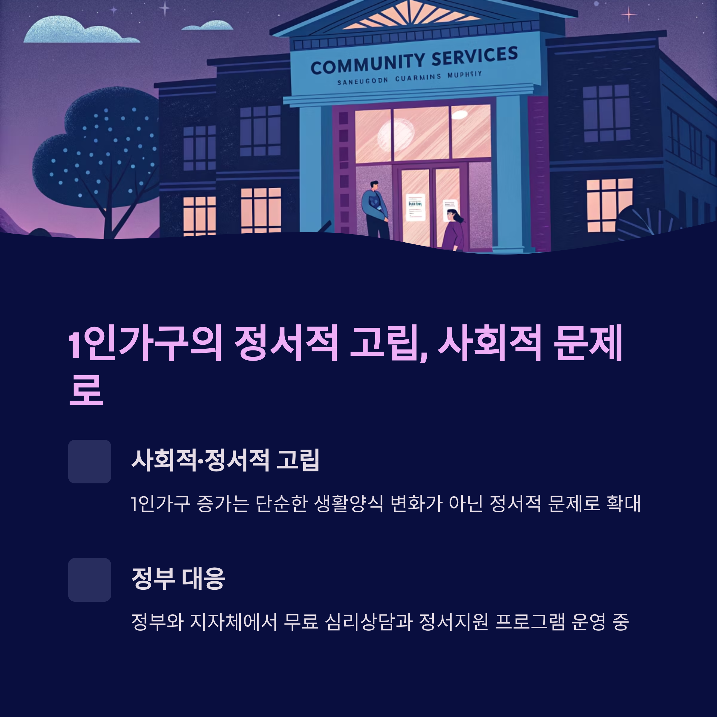 1인가구의 급증은 단순한 생활양식의 변화가 아닌, 사회적·정서적 고립 문제로 이어지고 있습니다.