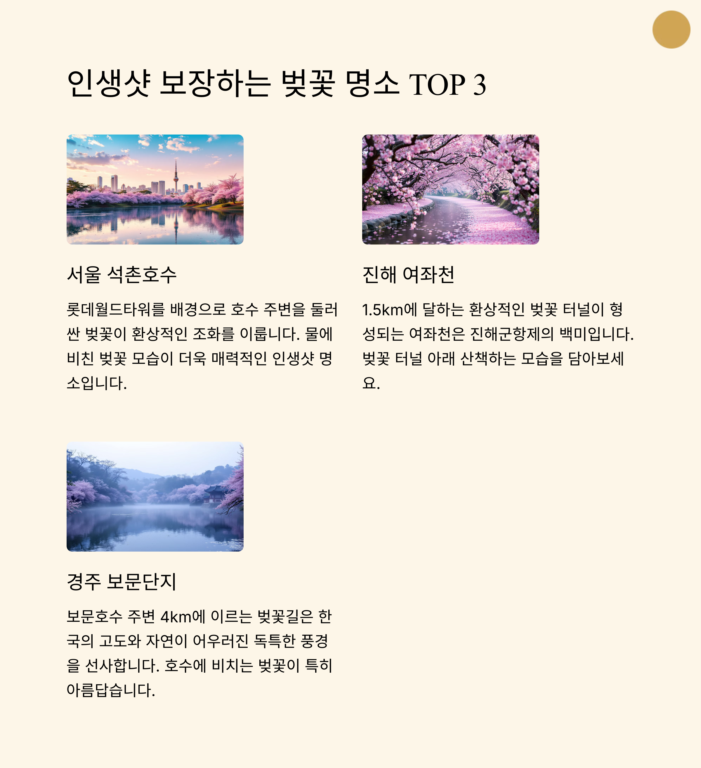 벚꽃 시즌엔 모두가 인생 사진을 노리죠! 아래는 SNS에서도 자주 등장하는 핫플레이스를 정리한 리스트예요.