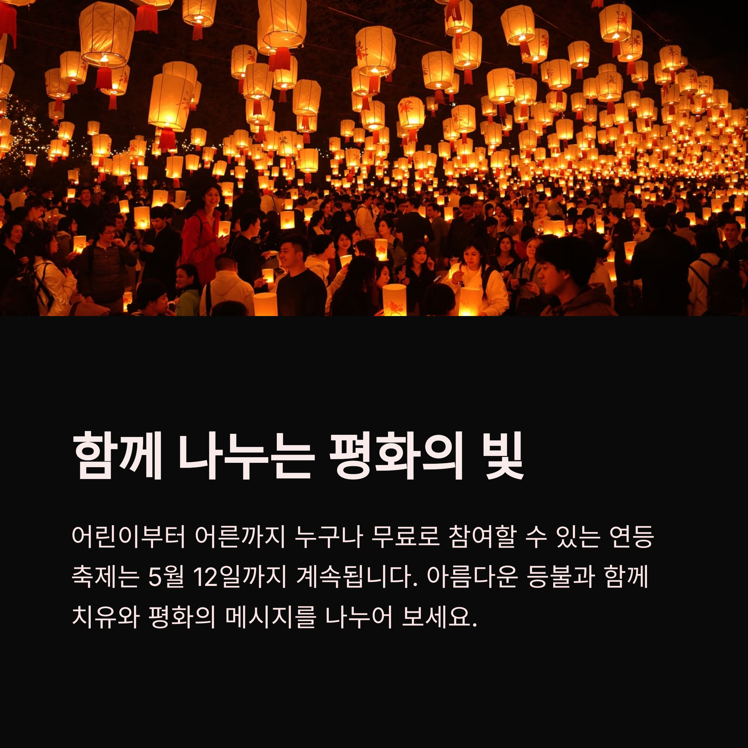 올해 연등회의 주제는 ‘치유와 평화’입니다. 현대 사회가 겪는 여러 갈등과 아픔 속에서 함께 위로 받고 연대하자는 메시지를 전하고 있어요. 그 어느 해보다도 깊은 울림을 주는 주제죠.