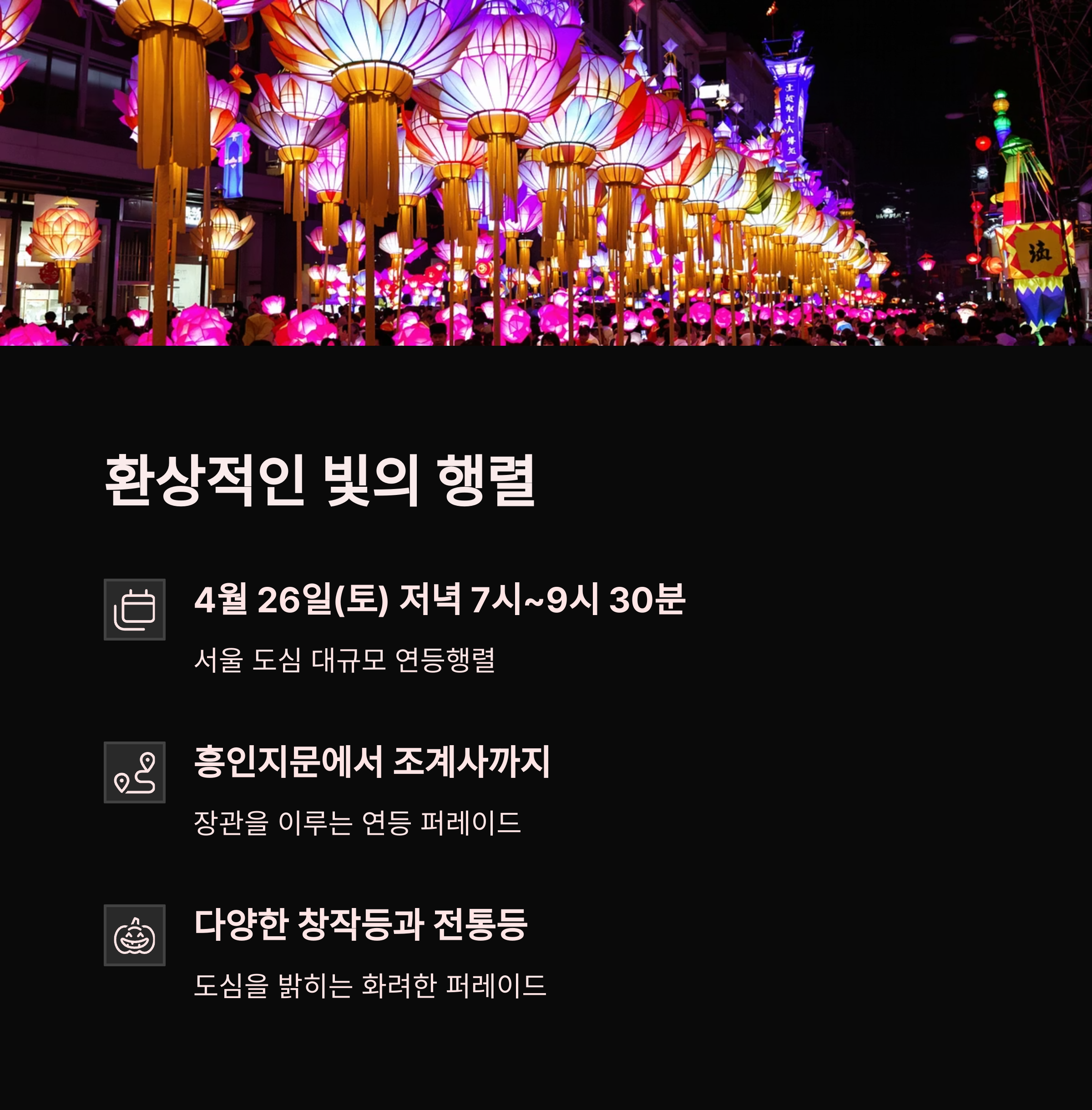 | 연등행렬 | 4.26 19:00~21:30 | 흥인지문~조계사 |