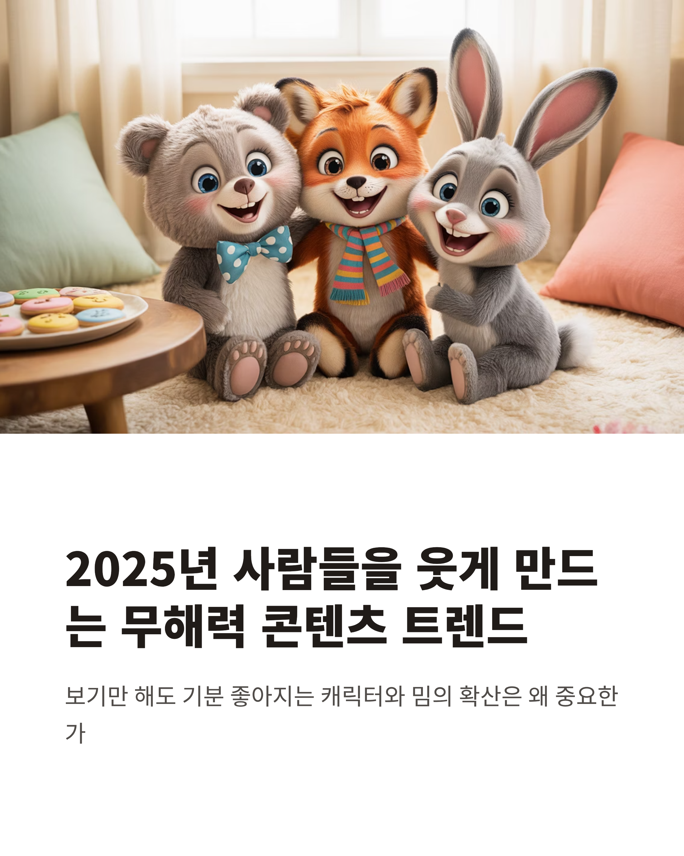 현대 사회에서 많은 사람들이 무거운 일상 속에서 작은 위로를 찾고 있습니다. 2025년 콘텐츠 시장은 자극적이지 않고, 오히려 조용하고 따뜻한 감정을 주는 무해력 콘텐츠가 큰 사랑을 받고 있습니다. 특히 밈 문화와 SNS를 중심으로 확산되는 유쾌한 캐릭터들은 세대를 아우르는 소통의 매개체가 되고 있습니다.