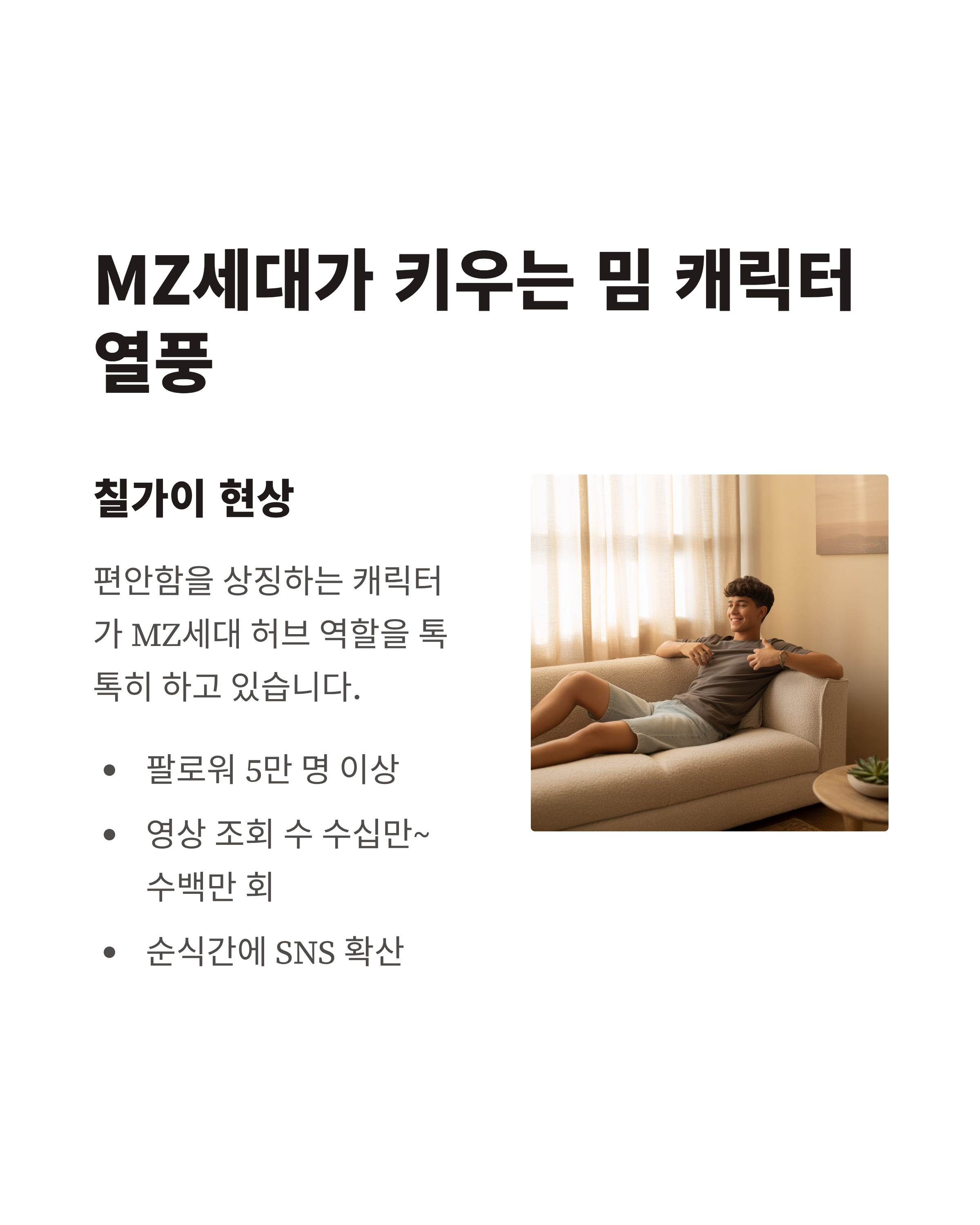 SNS에서는 새로운 밈이 순식간에 확산됩니다. 특히 ‘칠가이(Chill Guy)’처럼 편안함을 상징하는 캐릭터는 MZ세대 허브 역할을 톡톡히 하고 있습니다. 팔로워 5만 명 이상, 영상 조회 수는 수십만에서 수백만 회까지 기록하며 공감을 이끌어냅니다.