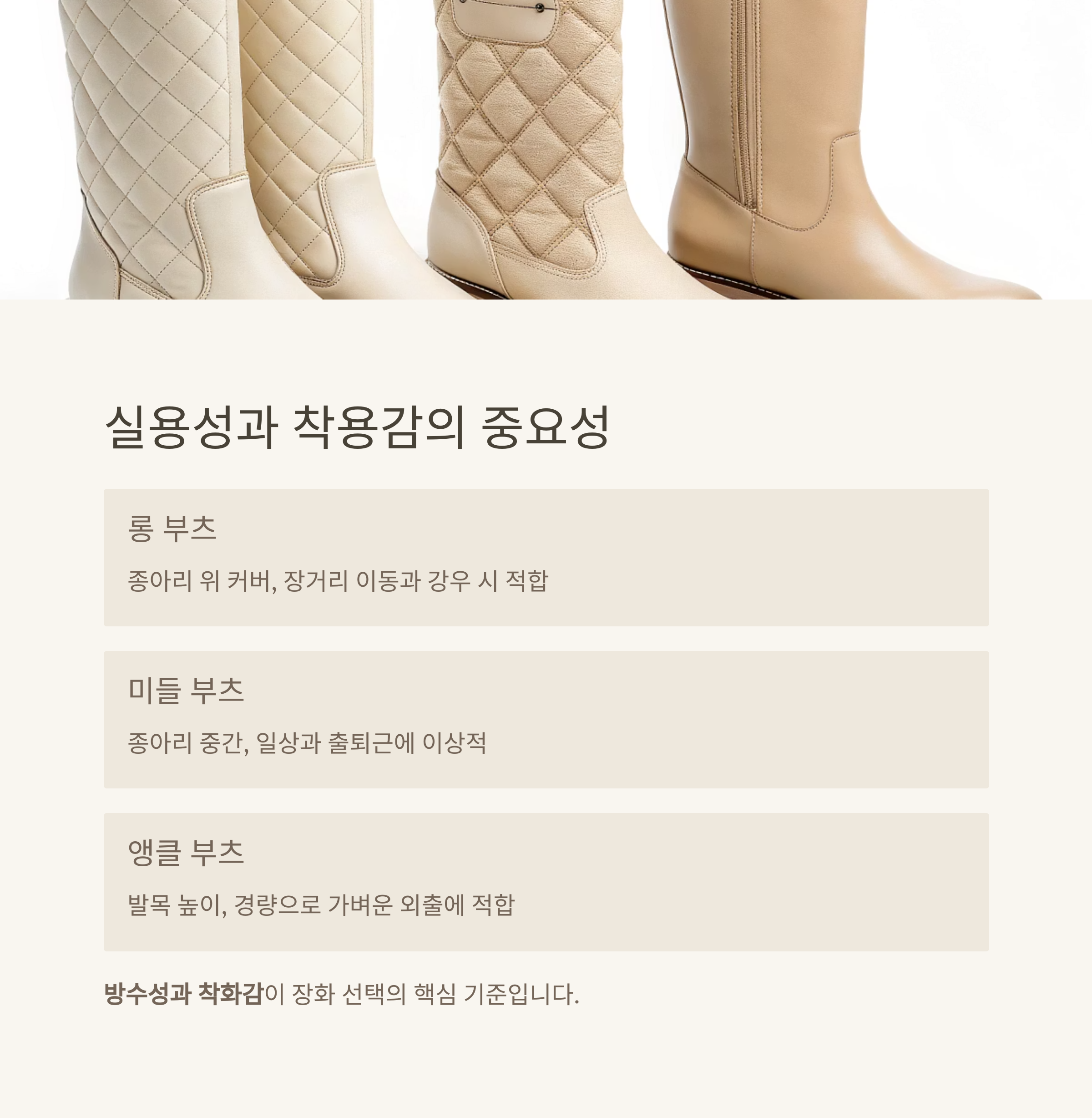 | 출퇴근·일상 | 미들 부츠 | 착화 편의성, 다양한 스타일링 가능 |