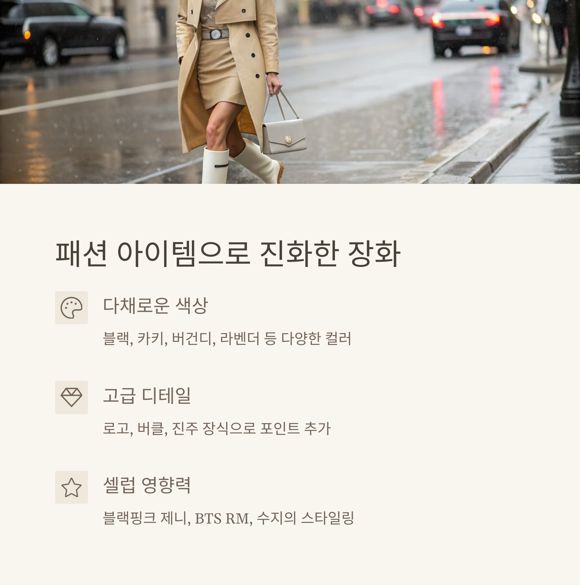 2025년, 장화는 단순한 우천용 신발을 넘어 사계절 스타일링의 중심 아이템으로 부상했습니다.