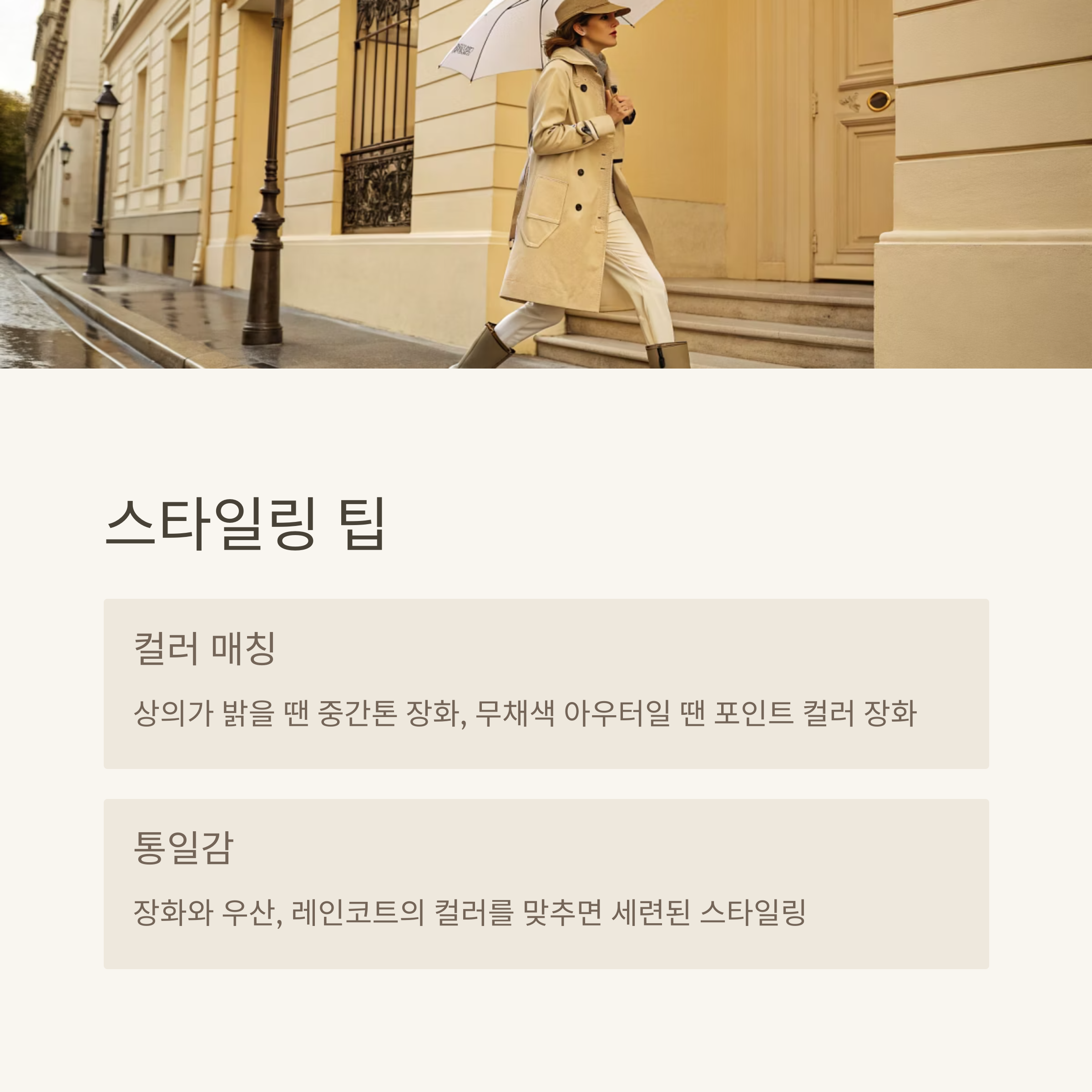 또한 장화와 우산, 레인코트의 컬러를 맞추면 통일감 있는 스타일링이 가능합니다.