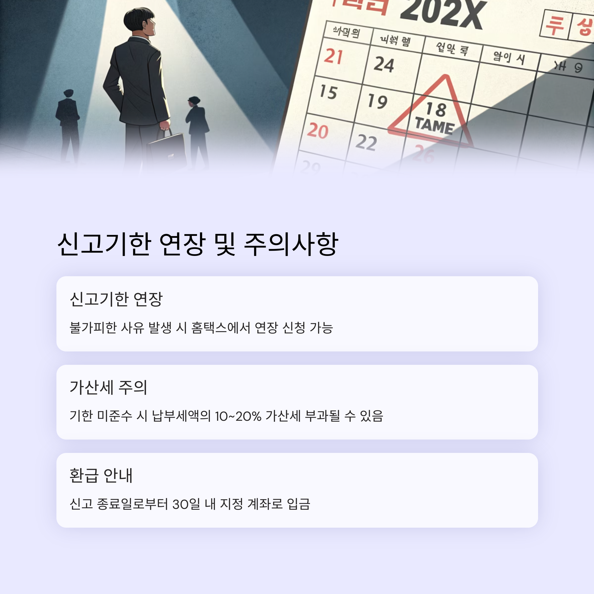 혹시 부득이하게 신고가 어려운 상황이 생긴다면 홈택스나 손택스를 통해 신고기한 연장 신청을 할 수 있어요. 다만 납부기한 3일 전까지만 신청이 가능하니 미리미리 준비하세요. 제때 신고·납부하지 않으면 가산세가 부과되니까요! 특히 과소 신고하거나 세금을 미납하면 10% 이상의 추가 세금이 붙을 수도 있답니다.