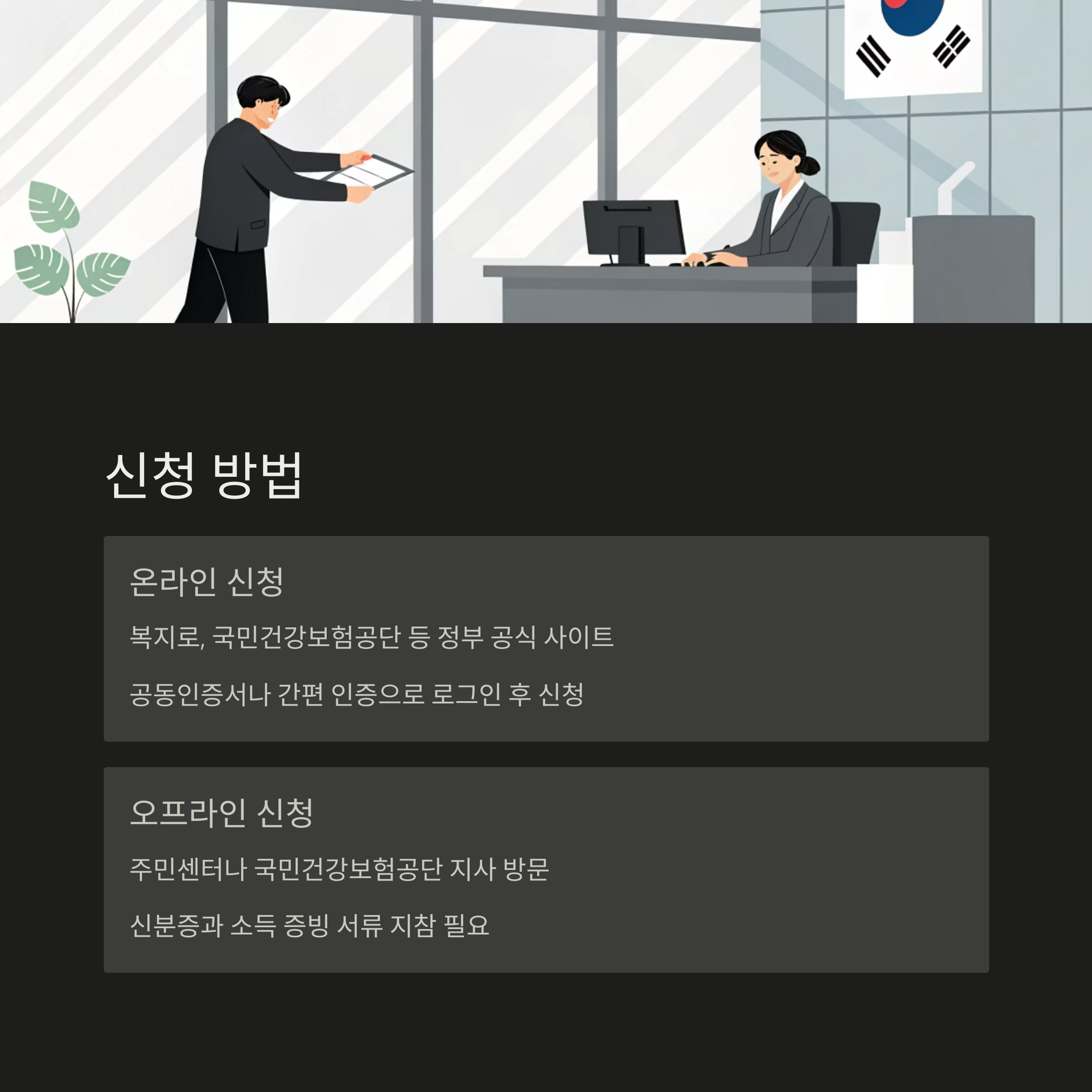 국민건강보험공단 지사 방문을 통해 진행되며, 신분증과 소득 증빙 서류를