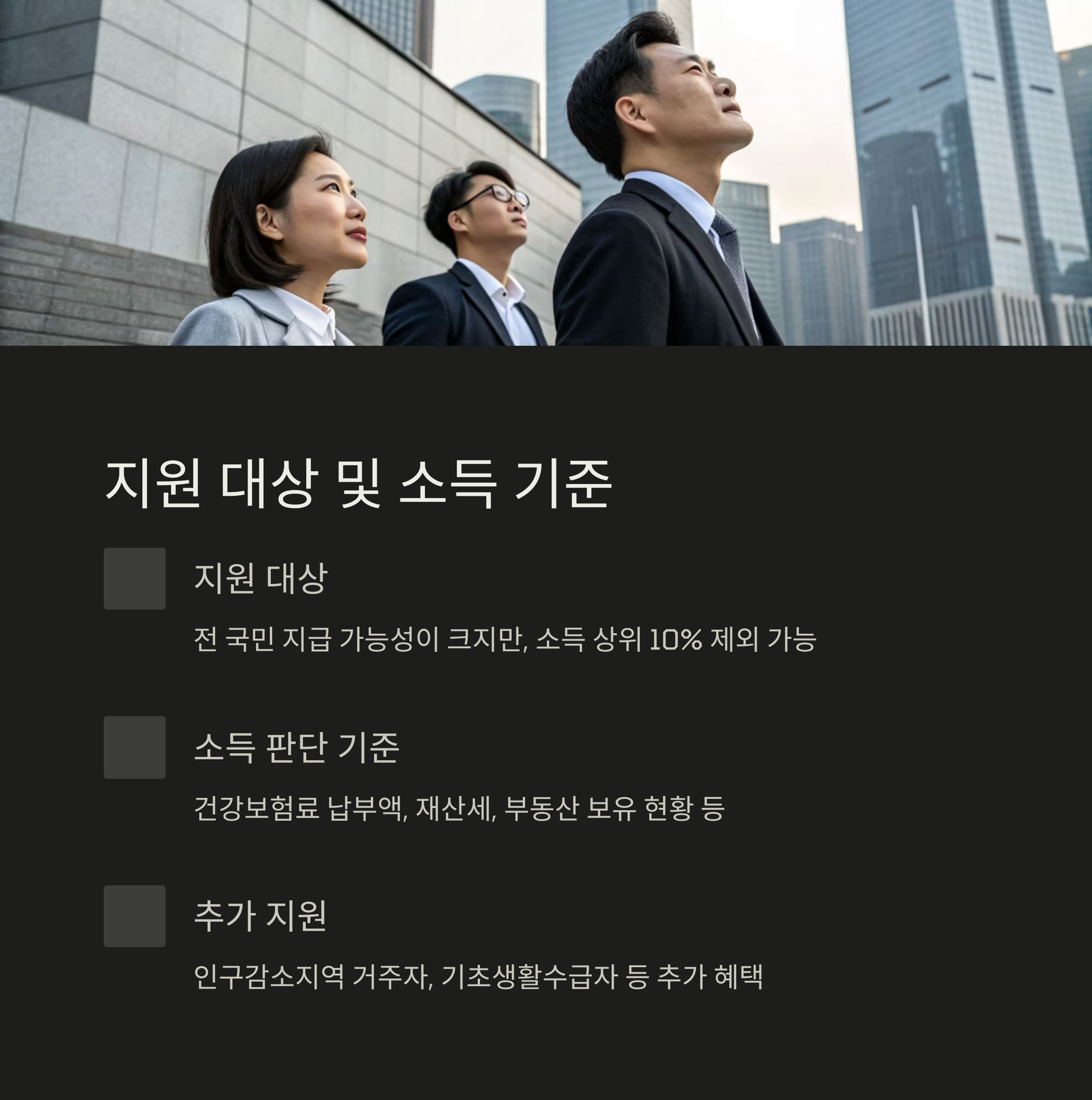 전 국민 지급 가능성이 크지만, 소득 상위 10%는 제외될 수 있습니다.