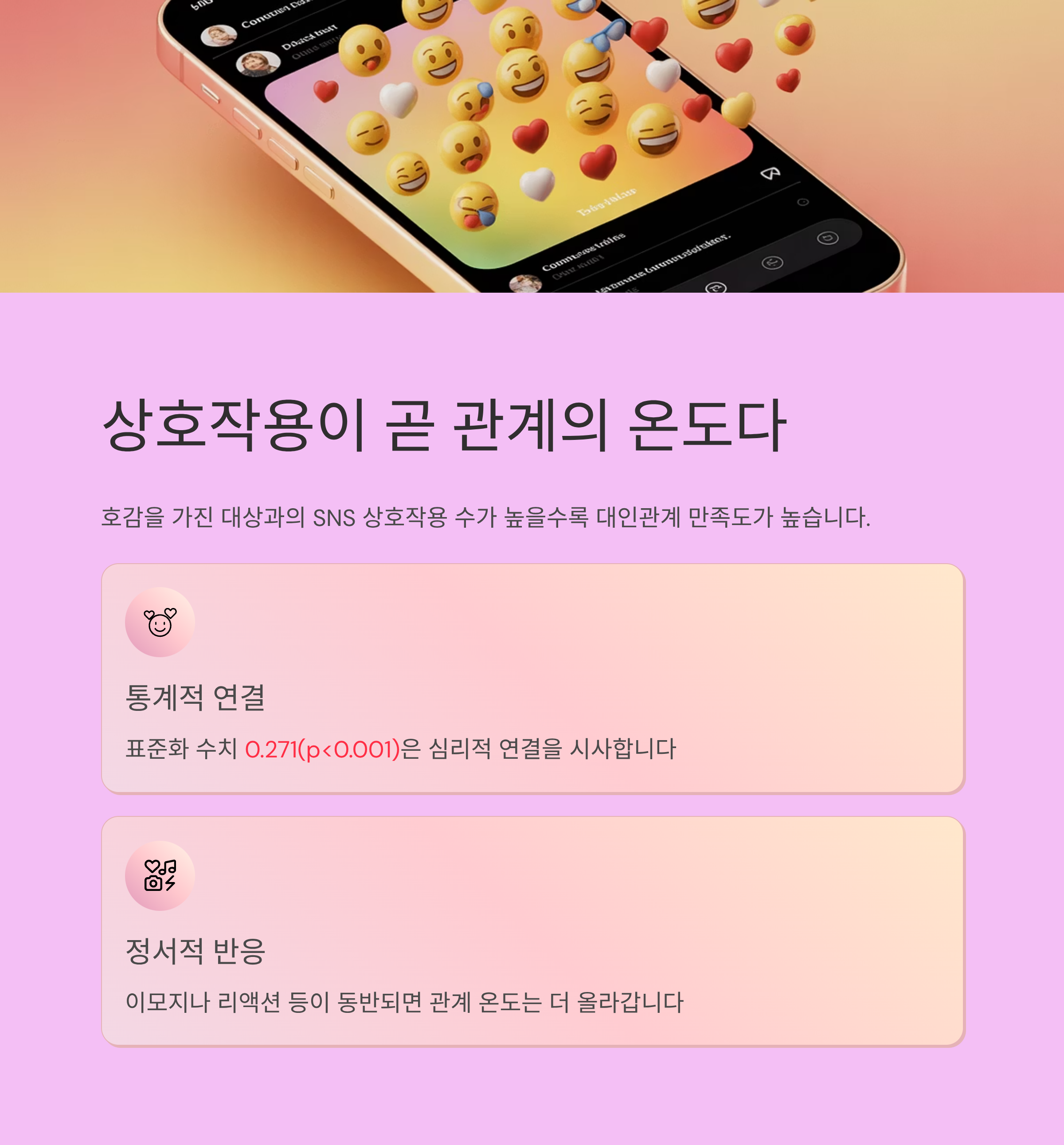 호감을 가진 대상과의 SNS 상호작용 수가 높을수록 대인관계 만족도가 높다는 통계가 존재합니다.