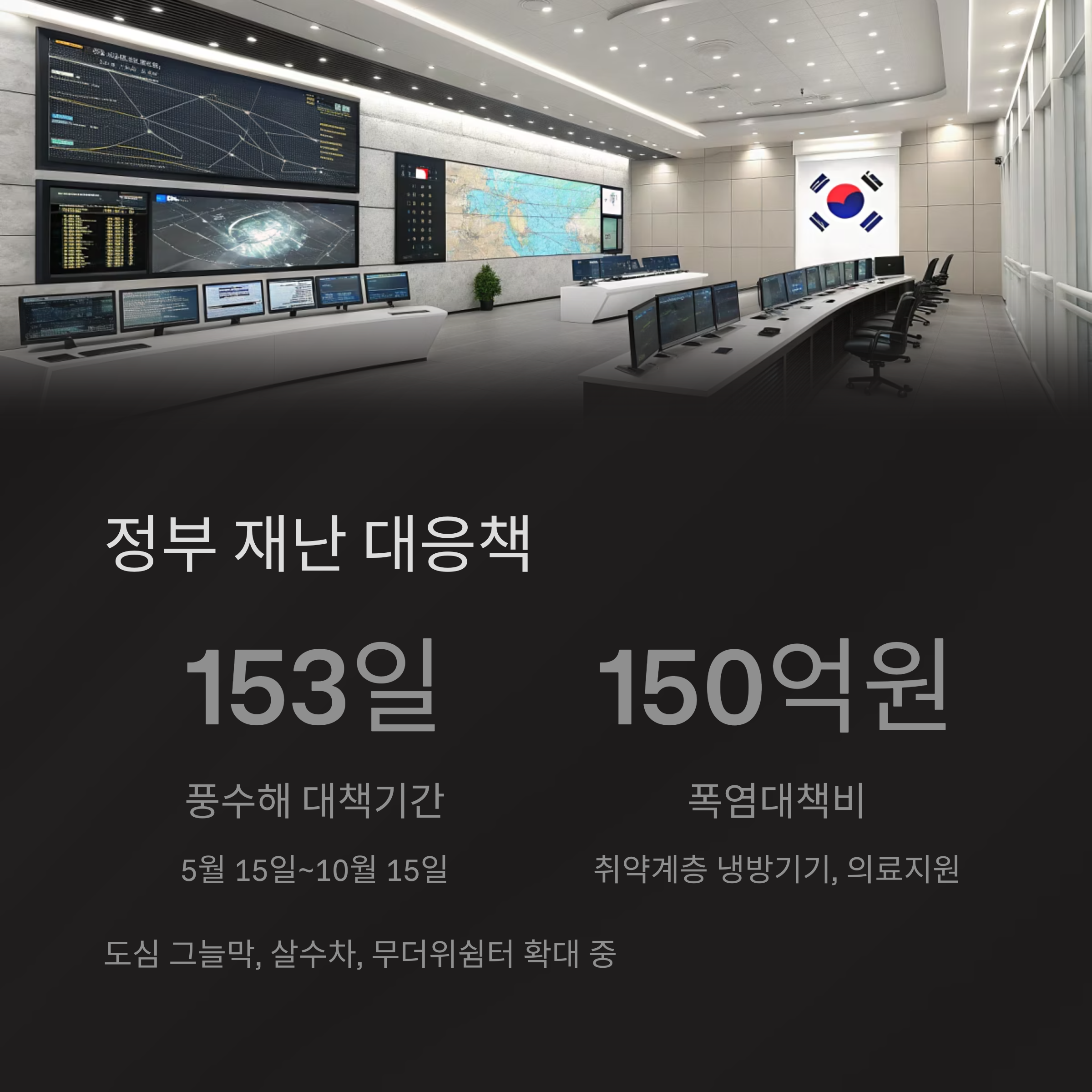 정부는 5월 15일부터 10월 15일까지 풍수해 대책기간을 운영하며, 폭염 대책은 9월 30일까지 강화됩니다.