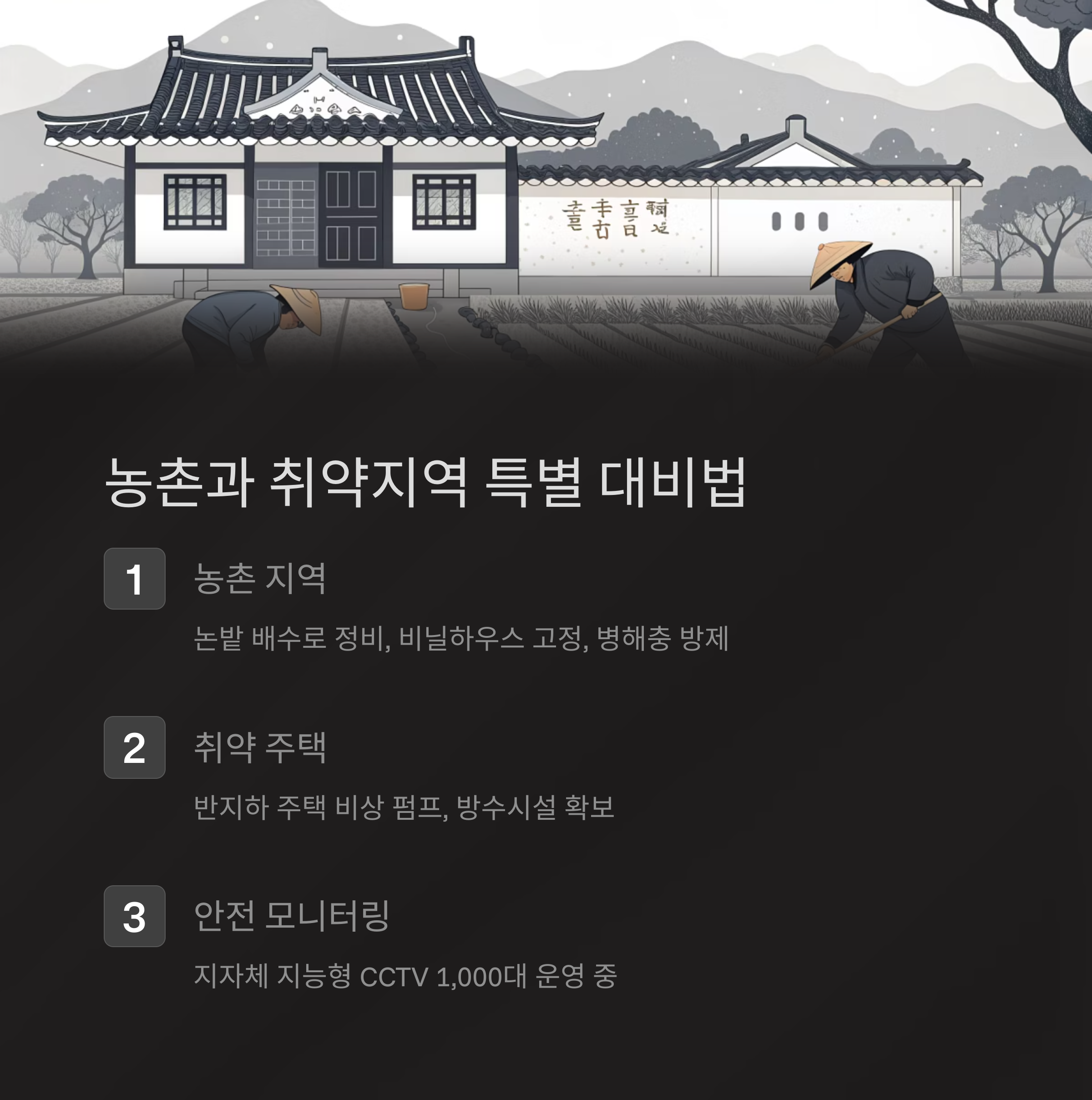 농촌 지역은 논밭 배수로를 정비하고, 비닐하우스 고정 및 병해충 방제를 우선해야 합니다.