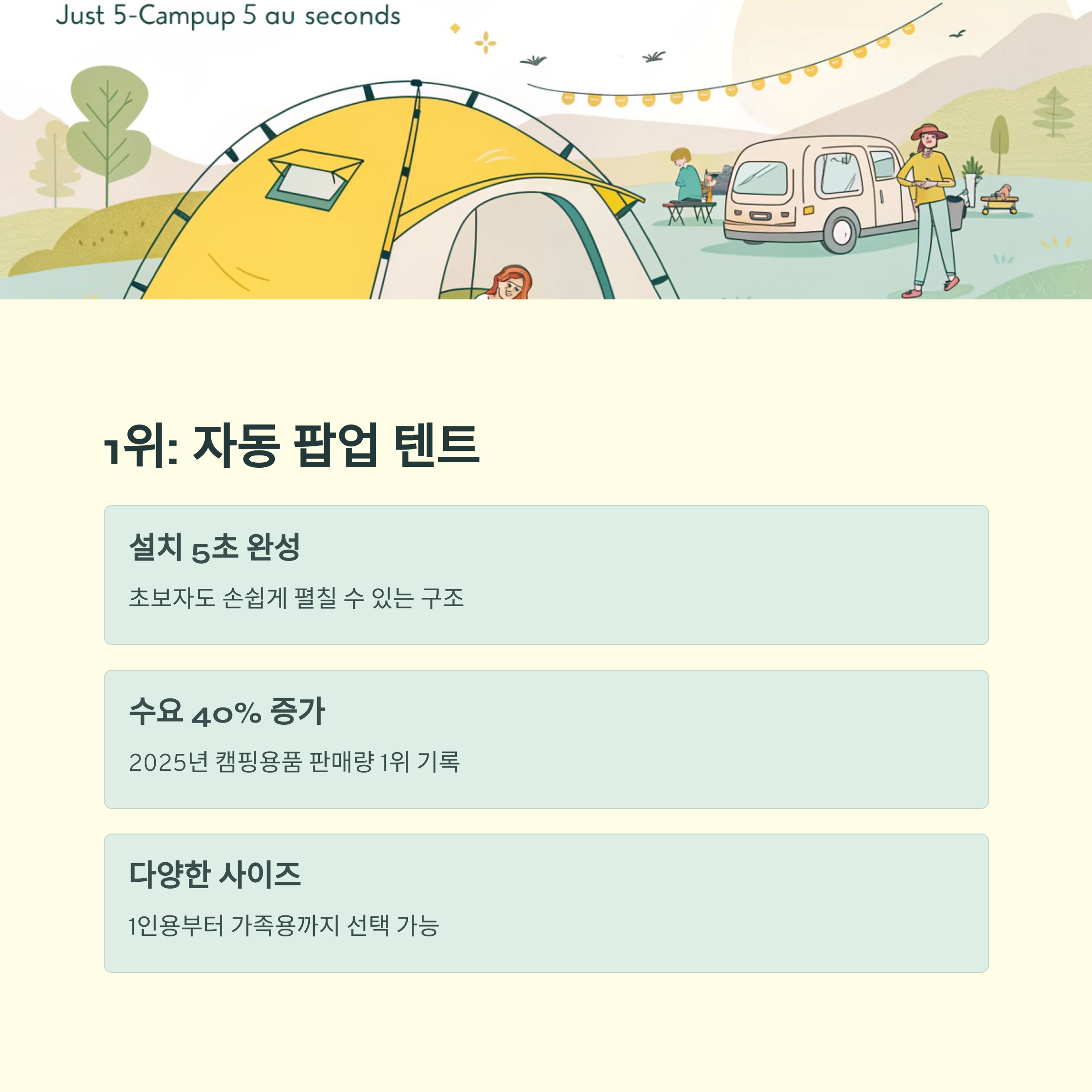 | 자동 팝업 텐트 | 설치 5초, 방수·통풍·내구성 | 초보도 설치 쉬움 |
