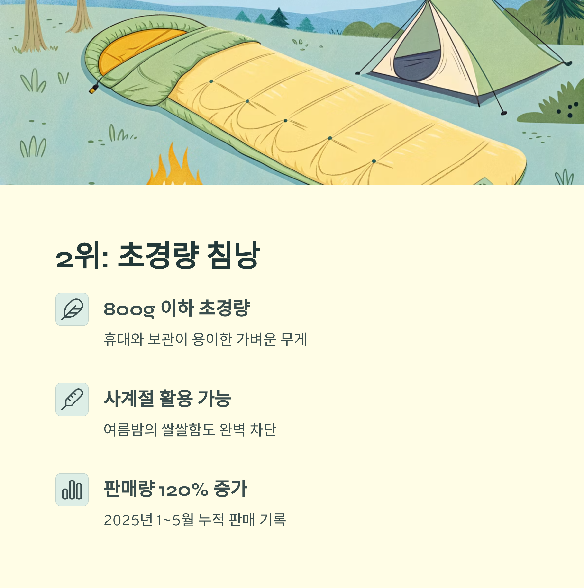 | 초경량 침낭 | 800g 이하, 사계절용 | 친환경·보온성·휴대성 |